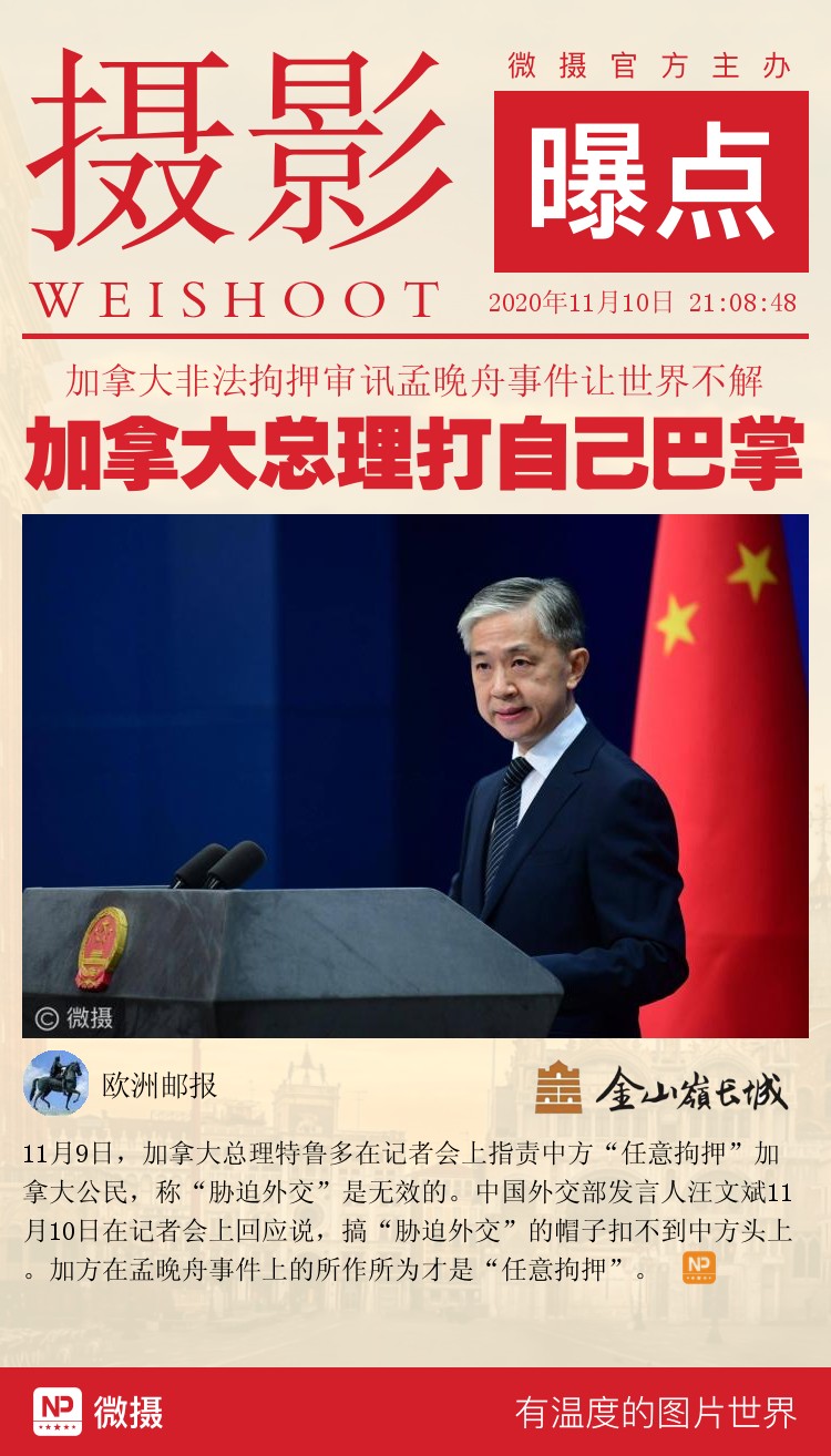 11月9日,加拿大总理特鲁多在记者会上指责中方“任意拘押”加拿大公民,称“胁迫外交”是无效的。中国外交部发言人汪文斌11月10日在记者会上回应说,搞“胁迫外交”的帽子扣不到中方头上。加方在孟晚舟事件上的所作所为才是“任意拘押”。