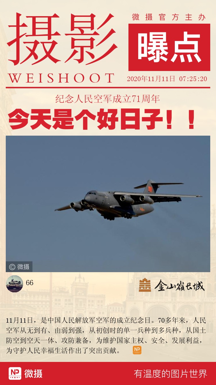 11月11日,是中国人民解放军空军的成立纪念日。70多年来,人民空军从无到有、由弱到强,从初创时的单一兵种到多兵种,从国土防空到空天一体、攻防兼备,为维护国家主权、安全、发展利益,为守护人民幸福生活作出了突出贡献。
