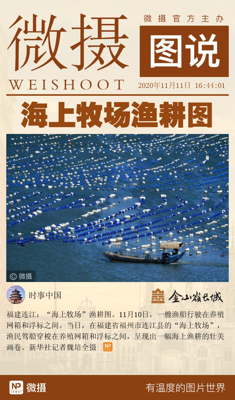 福建连江:“海上牧场”渔耕图。11月10日,一艘渔船行驶在养殖网箱和浮标之间。当日,在福建省福州市连江县的“海上牧场”,渔民驾船穿梭在养殖网箱和浮标之间,呈现出一幅海上渔耕的壮美画卷。新华社记者魏培全摄