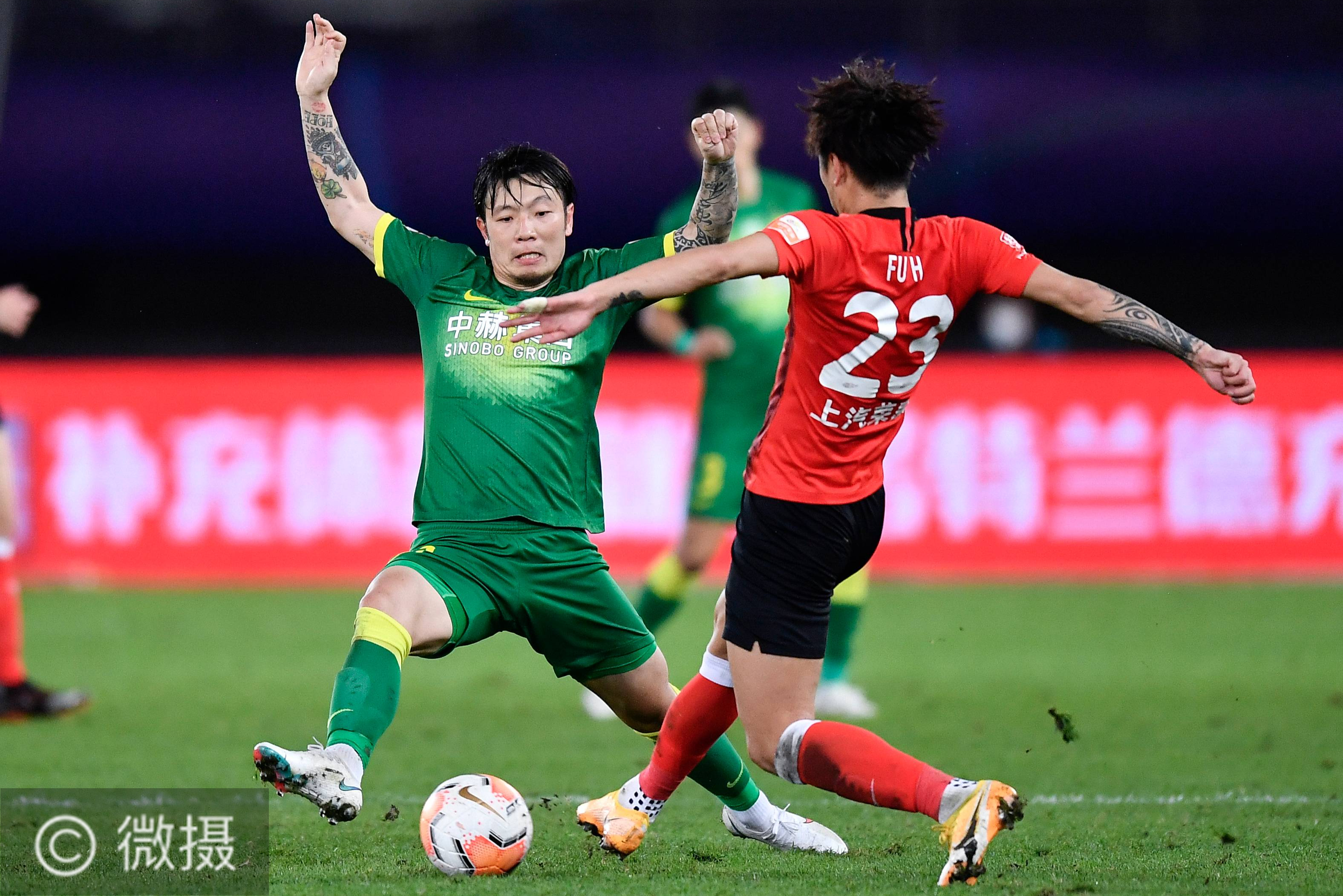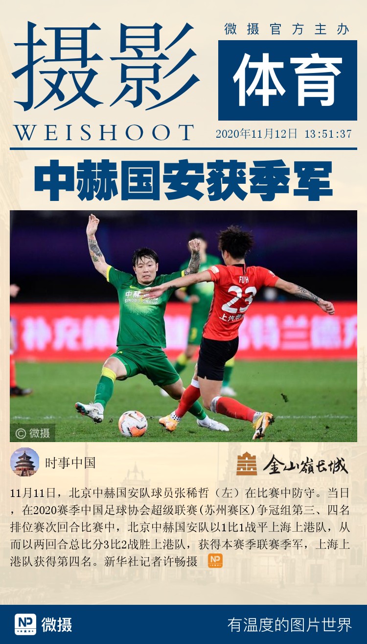 11月11日,北京中赫国安队球员张稀哲(左)在比赛中防守。当日,在2020赛季中国足球协会超级联赛(苏州赛区)争冠组第三、四名排位赛次回合比赛中,北京中赫国安队以1比1战平上海上港队,从而以两回合总比分3比2战胜上港队,获得本赛季联赛季军,上海上港队获得第四名。新华社记者许畅摄