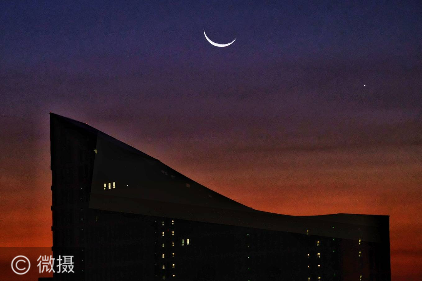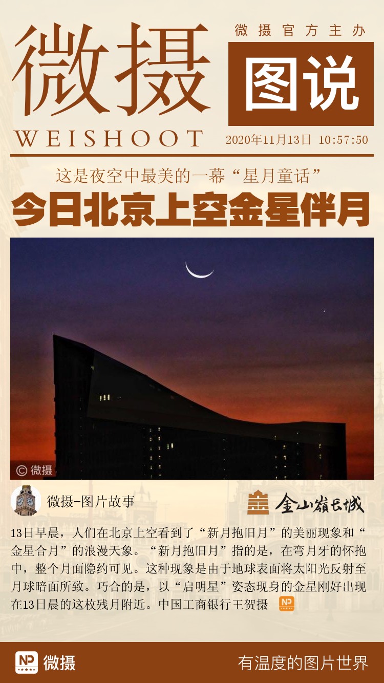 13日早晨,人们在北京上空看到了“新月抱旧月”的美丽现象和“金星合月”的浪漫天象。“新月抱旧月”指的是,在弯月牙的怀抱中,整个月面隐约可见。这种现象是由于地球表面将太阳光反射至月球暗面所致。巧合的是,以“启明星”姿态现身的金星刚好出现在13日晨的这枚残月附近。中国工商银行王贺摄