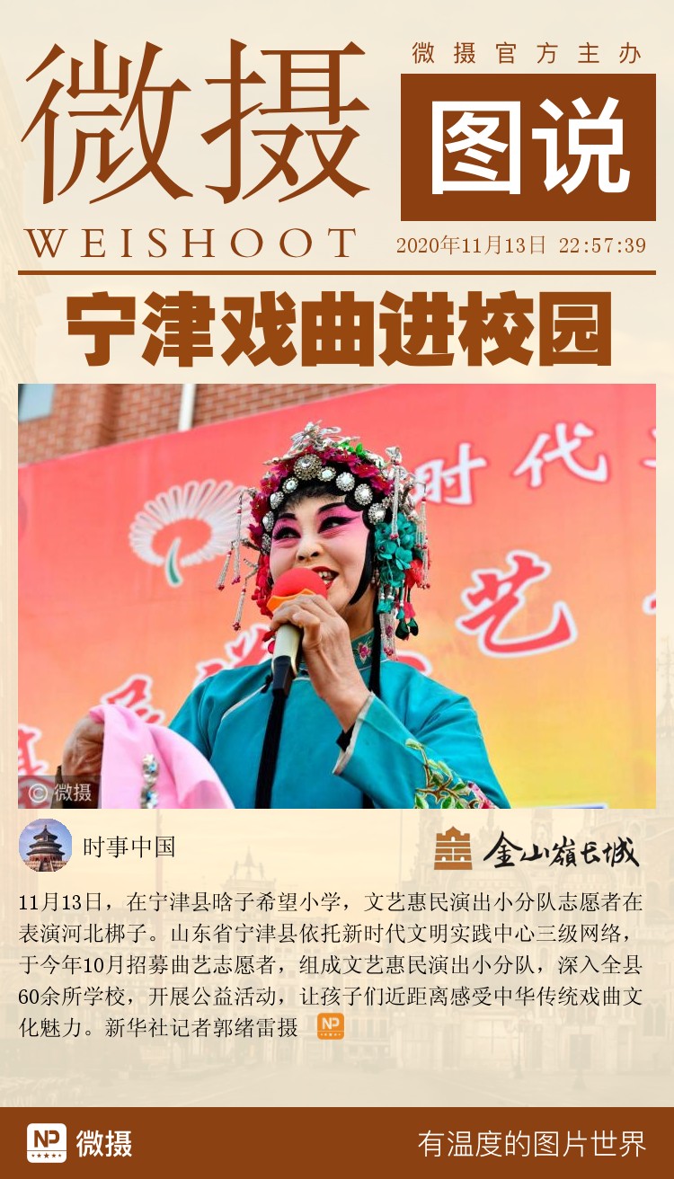 11月13日,在宁津县晗子希望小学,文艺惠民演出小分队志愿者在表演河北梆子。山东省宁津县依托新时代文明实践中心三级网络,于今年10月招募曲艺志愿者,组成文艺惠民演出小分队,深入全县60余所学校,开展公益活动,让孩子们近距离感受中华传统戏曲文化魅力。新华社记者郭绪雷摄