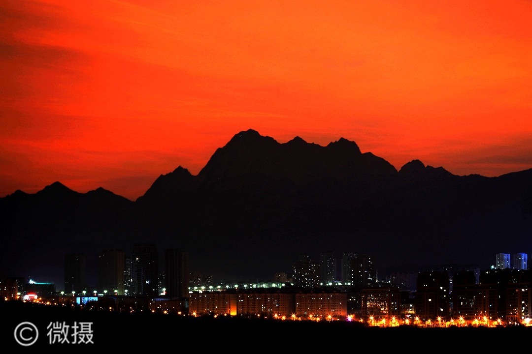 清晨,天山比邻的乌鲁木齐华灯初放,灯火璀璨。远眺天山的博格达峰,在朝霞的映衬下,如刀砍斧削一般巍峨挺拔。因天山山脉的横腰拦截,山的两侧天候迥然不同。东面早已是日薄东方,朝霞满天;西面仍是夜色茫茫,灯火辉煌。真是隔山不同天,天山现奇观。