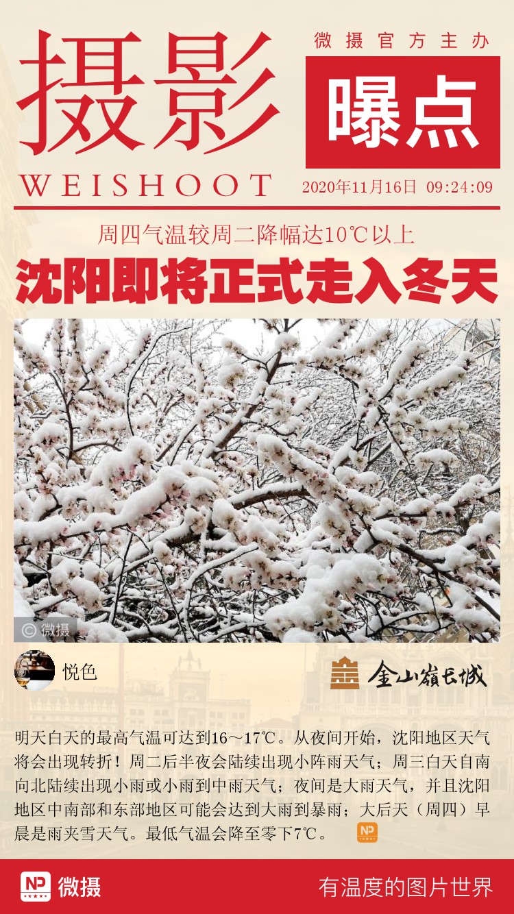 明天白天的最高气温可达到16~17℃。从夜间开始,沈阳地区天气将会出现转折!周二后半夜会陆续出现小阵雨天气;周三白天自南向北陆续出现小雨或小雨到中雨天气;夜间是大雨天气,并且沈阳地区中南部和东部地区可能会达到大雨到暴雨;大后天(周四)早晨是雨夹雪天气。最低气温会降至零下7℃。