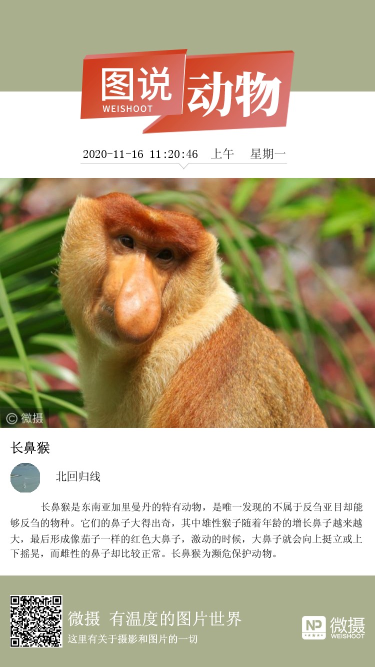 长鼻猴是东南亚加里曼丹的特有动物,是唯一发现的不属于反刍亚目却能够反刍的物种。它们的鼻子大得出奇,其中雄性猴子随着年龄的增长鼻子越来越大,最后形成像茄子一样的红色大鼻子,激动的时候,大鼻子就会向上挺立或上下摇晃,而雌性的鼻子却比较正常。长鼻猴为濒危保护动物。