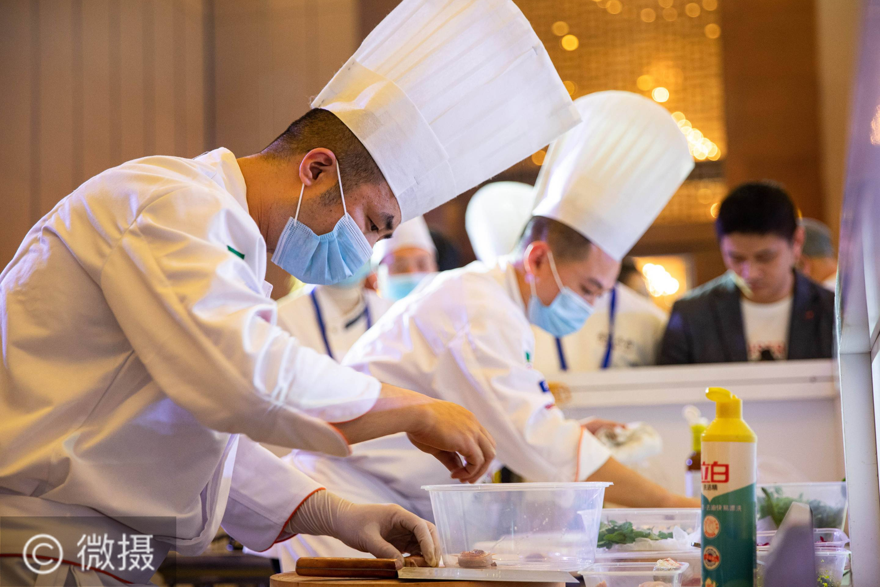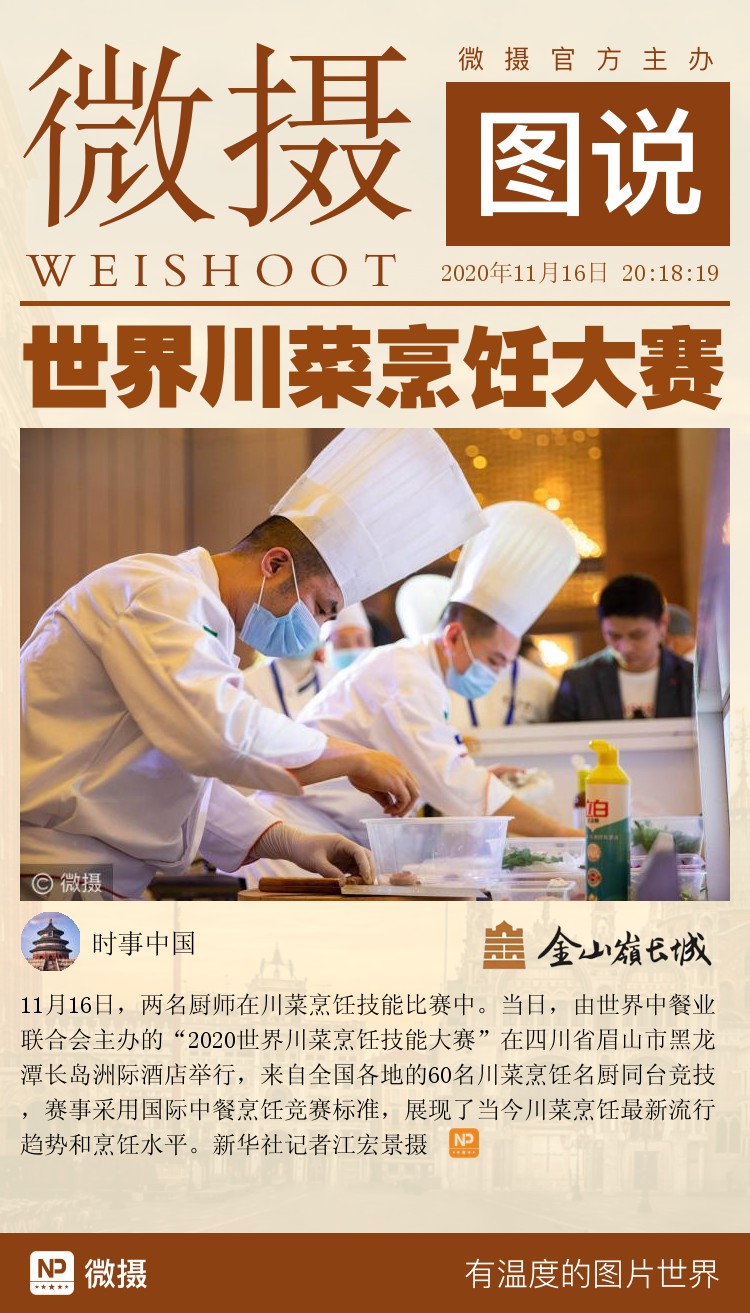 11月16日,两名厨师在川菜烹饪技能比赛中。当日,由世界中餐业联合会主办的“2020世界川菜烹饪技能大赛”在四川省眉山市黑龙潭长岛洲际酒店举行,来自全国各地的60名川菜烹饪名厨同台竞技,赛事采用国际中餐烹饪竞赛标准,展现了当今川菜烹饪最新流行趋势和烹饪水平。新华社记者江宏景摄