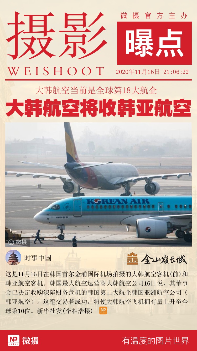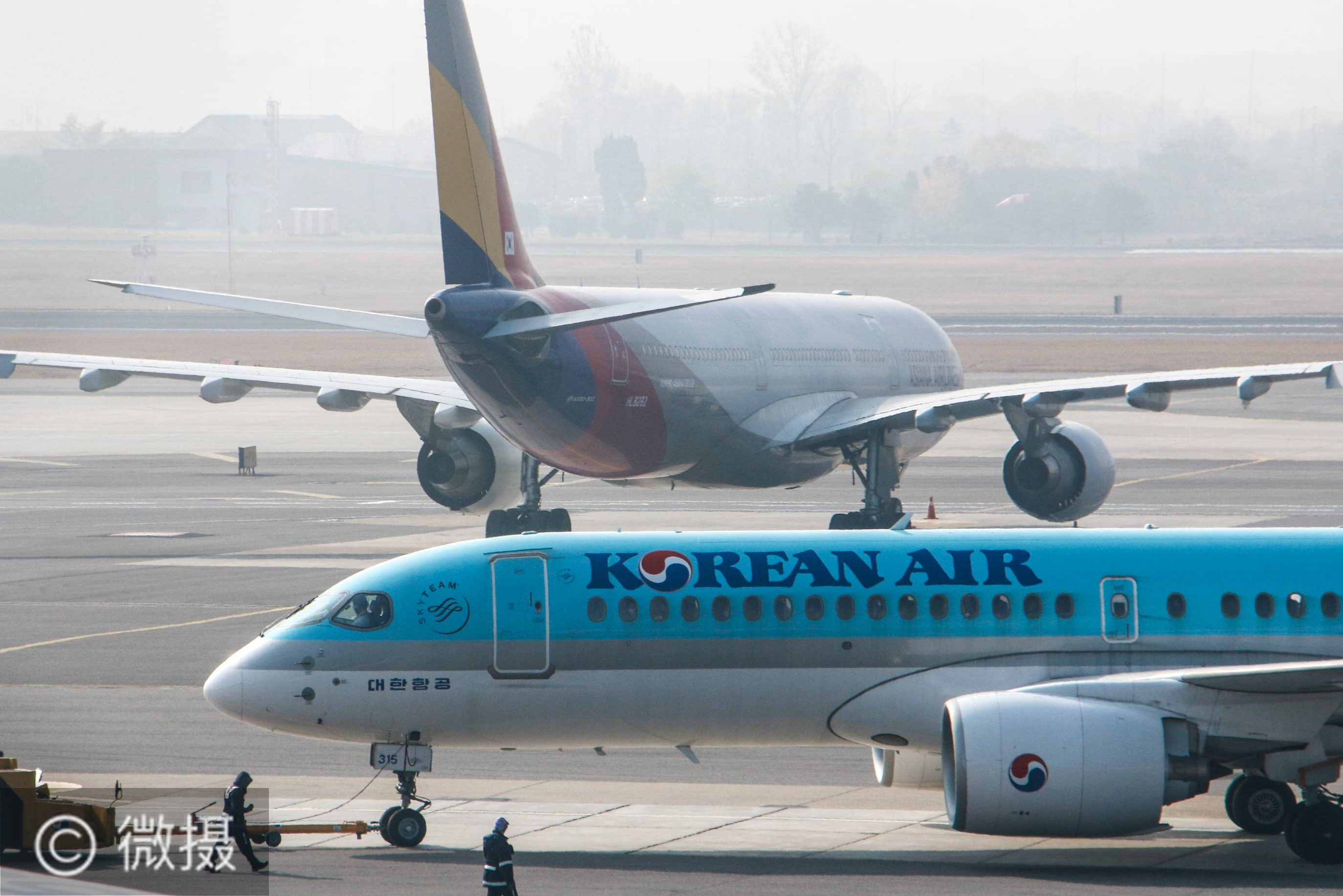 这是11月16日在韩国首尔金浦国际机场拍摄的大韩航空客机(前)和韩亚航空客机。韩国最大航空运营商大韩航空公司16日说,其董事会已决定收购深陷财务危机的韩国第二大航企韩国亚洲航空公司(韩亚航空)。这笔交易若成功,将使大韩航空飞机拥有量上升至全球第10位。新华社发(李相浩摄)