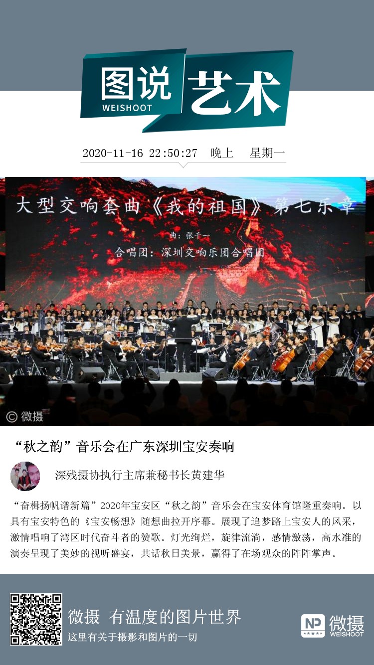 “奋楫扬帆谱新篇”2020年宝安区“秋之韵”音乐会在宝安体育馆隆重奏响。以具有宝安特色的《宝安畅想》随想曲拉开序幕。展现了追梦路上宝安人的风采,激情唱响了湾区时代奋斗者的赞歌。灯光绚烂,旋律流淌,感情激荡,高水准的演奏呈现了美妙的视听盛宴,共话秋日美景,赢得了在场观众的阵阵掌声。
