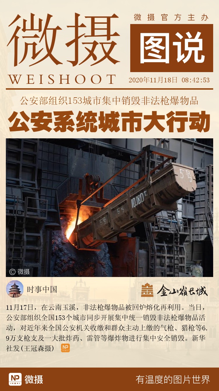 11月17日,在云南玉溪,非法枪爆物品被回炉熔化再利用。当日,公安部组织全国153个城市同步开展集中统一销毁非法枪爆物品活动,对近年来全国公安机关收缴和群众主动上缴的气枪、猎枪等6.9万支枪支及一大批炸药、雷管等爆炸物进行集中安全销毁。新华社发(王冠森摄)