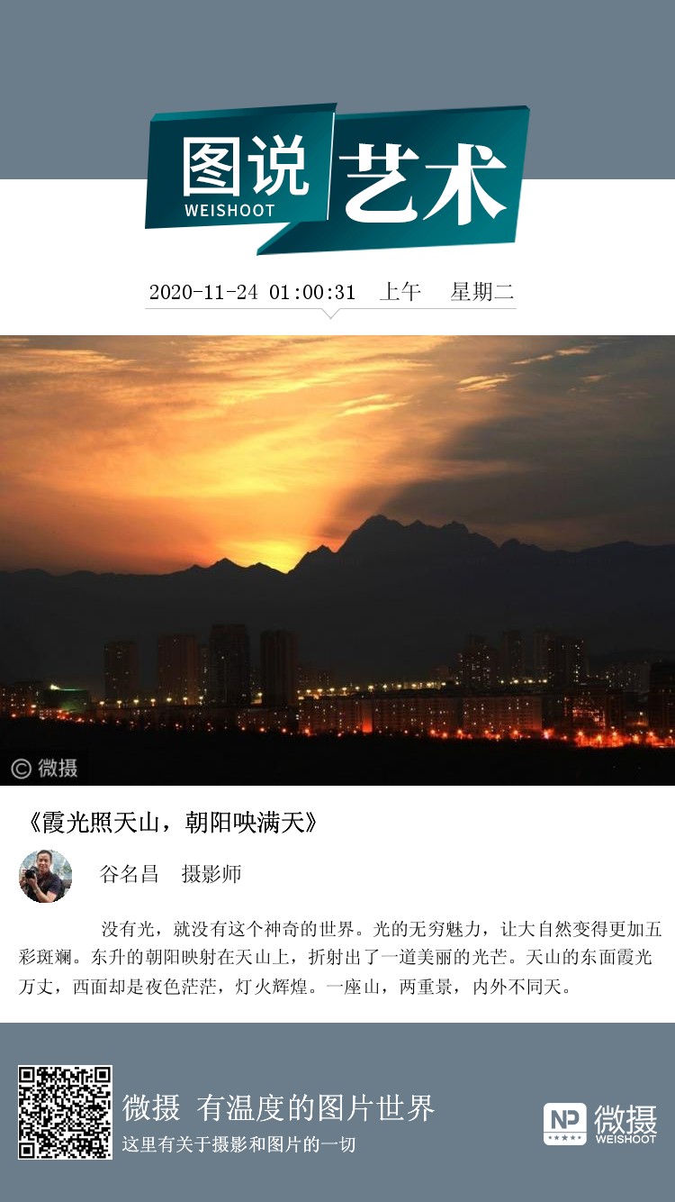 没有光,就没有这个神奇的世界。光的无穷魅力,让大自然变得更加五彩斑斓。东升的朝阳映射在天山上,折射出了一道美丽的光芒。天山的东面霞光万丈,西面却是夜色茫茫,灯火辉煌。一座山,两重景,内外不同天。