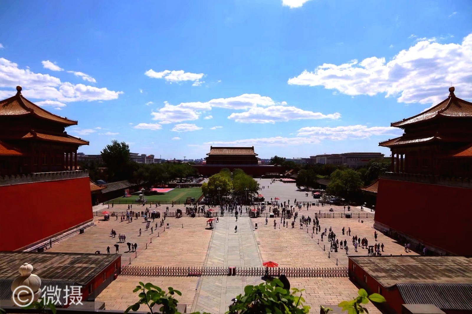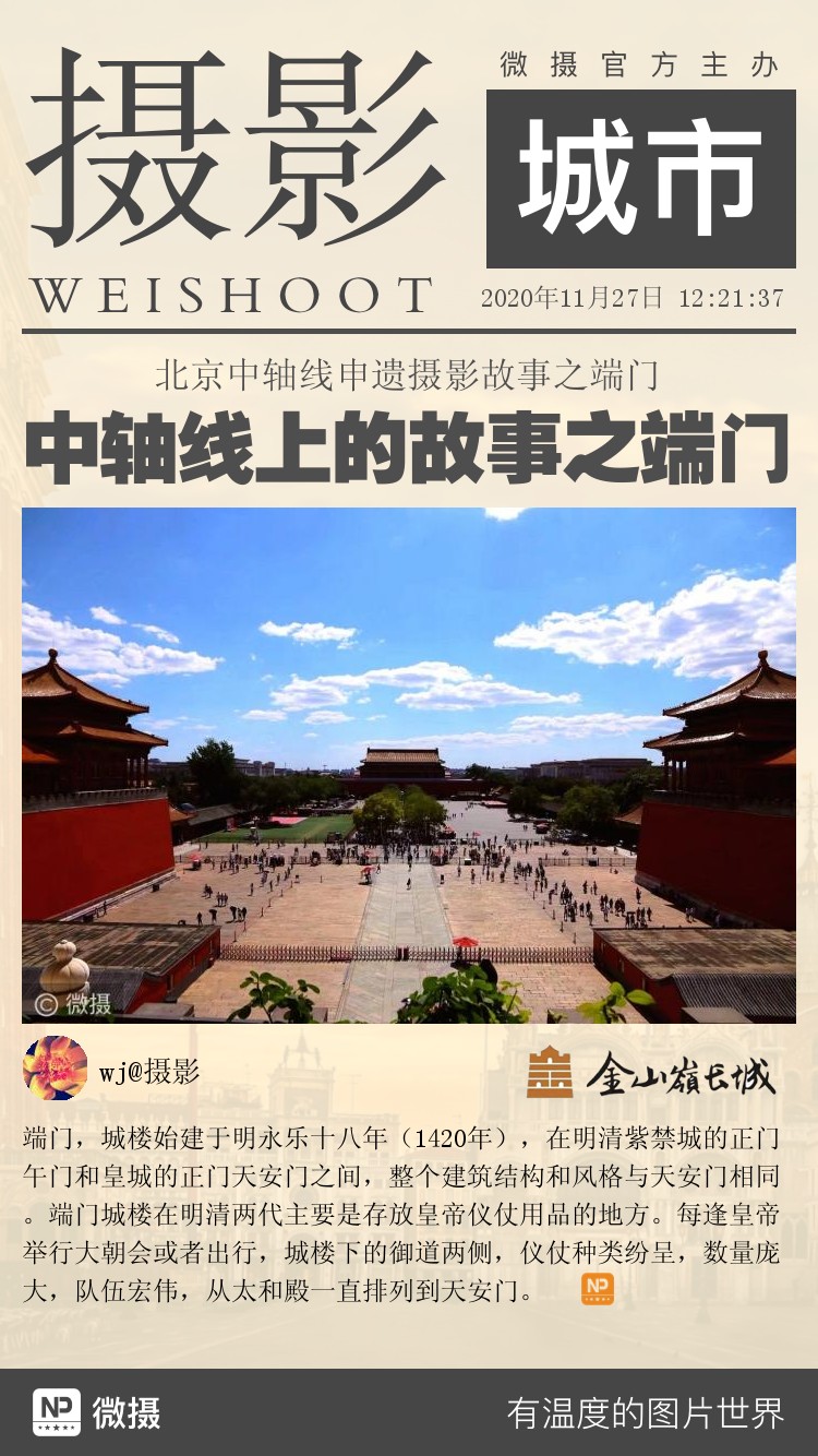 端门,城楼始建于明永乐十八年(1420年),在明清紫禁城的正门午门和皇城的正门天安门之间,整个建筑结构和风格与天安门相同。端门城楼在明清两代主要是存放皇帝仪仗用品的地方。每逢皇帝举行大朝会或者出行,城楼下的御道两侧,仪仗种类纷呈,数量庞大,队伍宏伟,从太和殿一直排列到天安门。