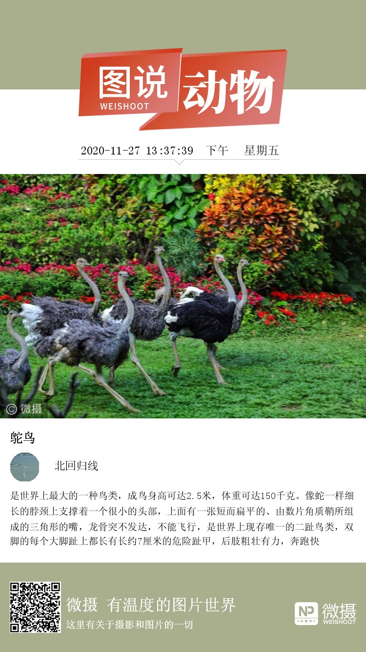 是世界上最大的一种鸟类,成鸟身高可达2.5米,体重可达150千克。像蛇一样细长的脖颈上支撑着一个很小的头部,上面有一张短而扁平的、由数片角质鞘所组成的三角形的嘴,龙骨突不发达,不能飞行,是世界上现存唯一的二趾鸟类,双脚的每个大脚趾上都长有长约7厘米的危险趾甲,后肢粗壮有力,奔跑快