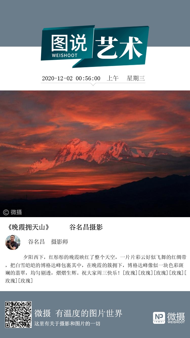 夕阳西下,红彤彤的晚霞映红了整个天空,一片片彩云好似飞舞的红绸带,把白雪皑皑的博格达峰包裹其中,在晚霞的簇拥下,博格达峰像似一块色彩斑斓的翡翠,均匀剔透,熠熠生辉。祝大家周三快乐![玫瑰][玫瑰][玫瑰][玫瑰][玫瑰][玫瑰]