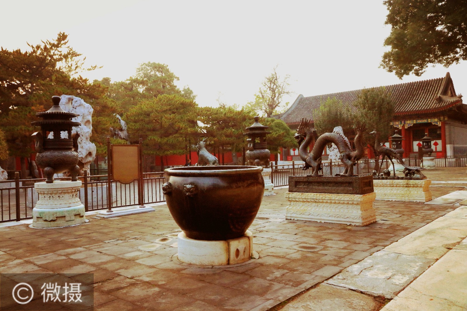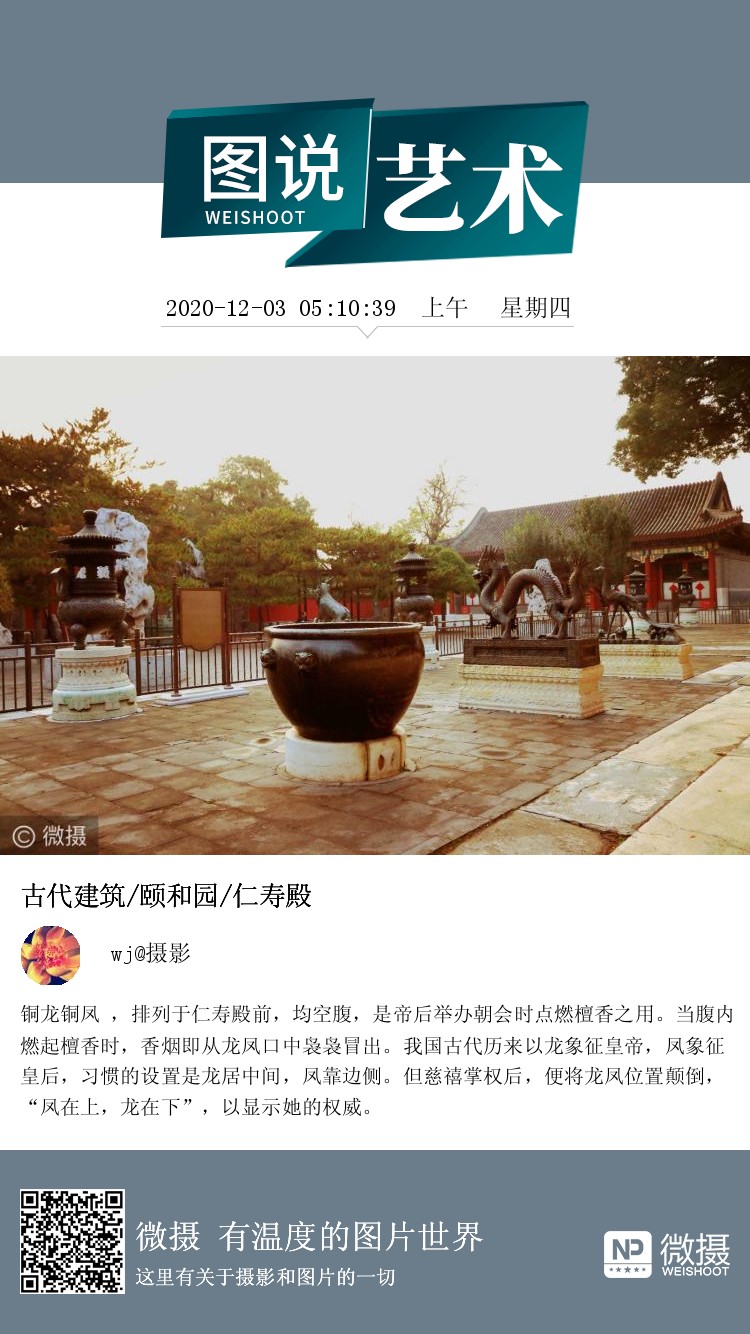 铜龙铜凤 ,排列于仁寿殿前,均空腹,是帝后举办朝会时点燃檀香之用。当腹内燃起檀香时,香烟即从龙凤口中袅袅冒出。我国古代历来以龙象征皇帝,凤象征皇后,习惯的设置是龙居中间,凤靠边侧。但慈禧掌权后,便将龙凤位置颠倒,“凤在上,龙在下”,以显示她的权威。