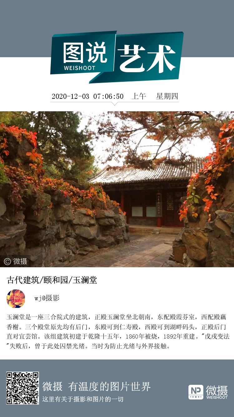 玉澜堂是一座三合院式的建筑,正殿玉澜堂坐北朝南,东配殿霞芬室,西配殿藕香榭。三个殿堂原先均有后门,东殿可到仁寿殿,西殿可到湖畔码头,正殿后门直对宜芸馆。该组建筑初建于乾隆十五年,1860年被烧,1892年重建。"戊戌变法"失败后,曾于此处囚禁光绪。当时为防止光绪与外界接触。