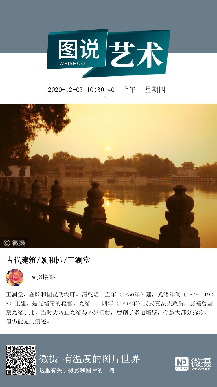 玉澜堂,在颐和园昆明湖畔。清乾隆十五年(1750年)建,光绪年间(1875-1908)重建。是光绪帝的寝宫。光绪二十四年(1898年)戊戌变法失败后,慈禧曾幽禁光绪于此。当时为防止光绪与外界接触,曾砌了多道墙壁,今虽大部分拆除,但仍能见到痕迹。