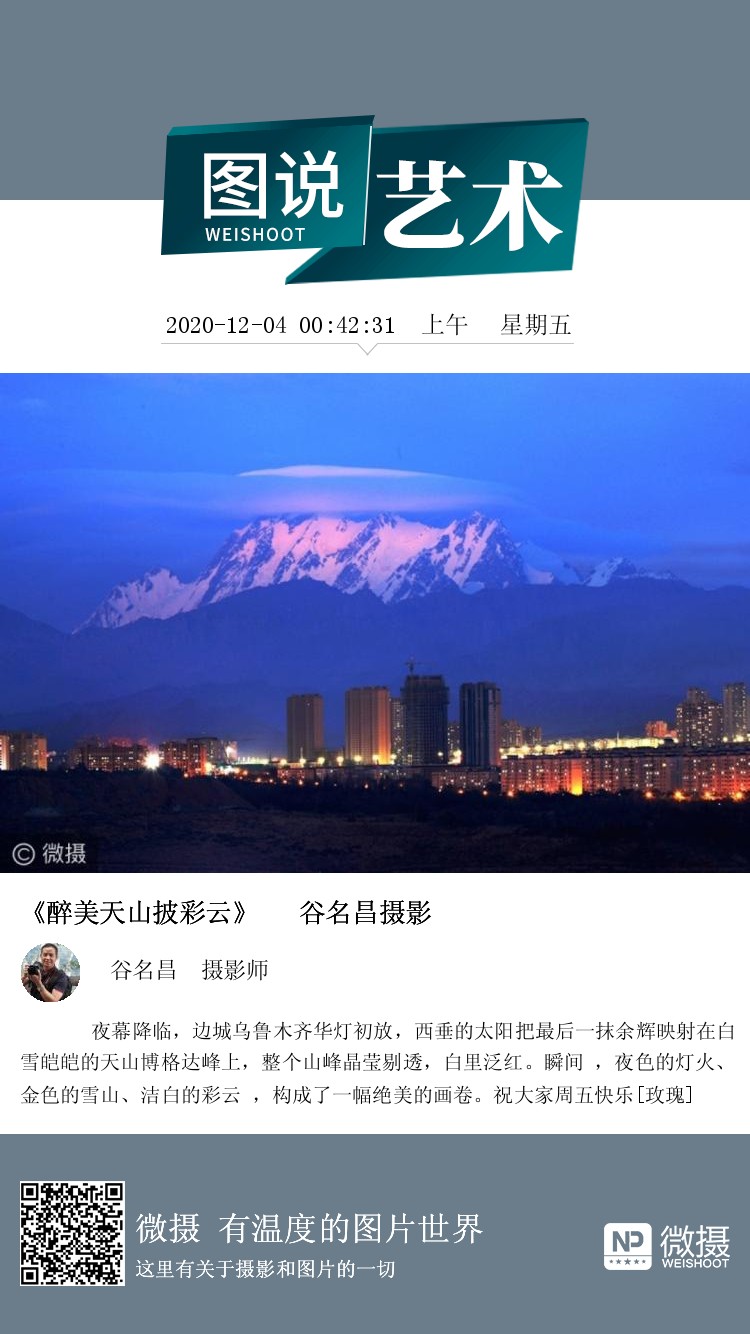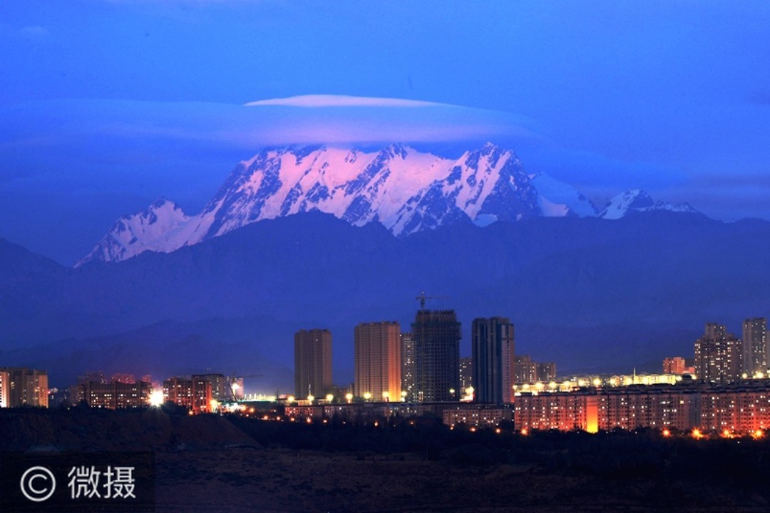 夜幕降临,边城乌鲁木齐华灯初放,西垂的太阳把最后一抹余辉映射在白雪皑皑的天山博格达峰上,整个山峰晶莹剔透,白里泛红。瞬间 ,夜色的灯火、金色的雪山、洁白的彩云 ,构成了一幅绝美的画卷。祝大家周五快乐[玫瑰]
