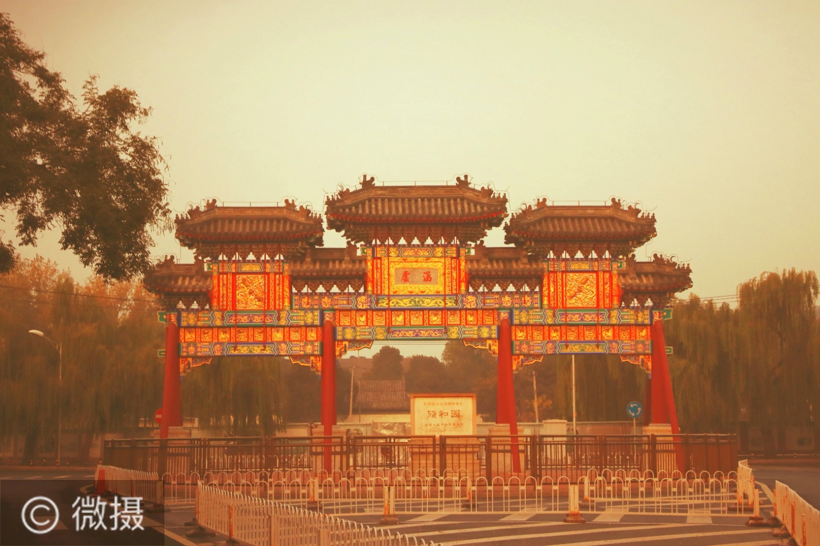 牌楼,颐和园在清乾隆十五年(公元1750年)修建清漪园时,在大宫门(今称东宫门)外,修建了一座四柱三间三楼木质牌楼。牌楼东西两侧各嵌有一块匾额,东侧为“罨秀”,西侧为“涵虚”。这座牌楼被视为颐和园的第一道景观,从乾隆年间的《万寿庆典图》上可领略清漪园时期大宫门牌楼的旧貌。