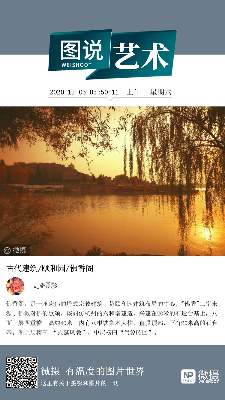 佛香阁,是一座宏伟的塔式宗教建筑,是颐和园建筑布局的中心。"佛香"二字来源于佛教对佛的歌颂。该阁仿杭州的六和塔建造,兴建在20米的石造台基上,八面三层四重檐。高约40米,内有八根铁梨木大柱,直贯顶部,下有20米高的石台基。阁上层榜曰 “式延风教”,中层榜曰“气象昭回”。