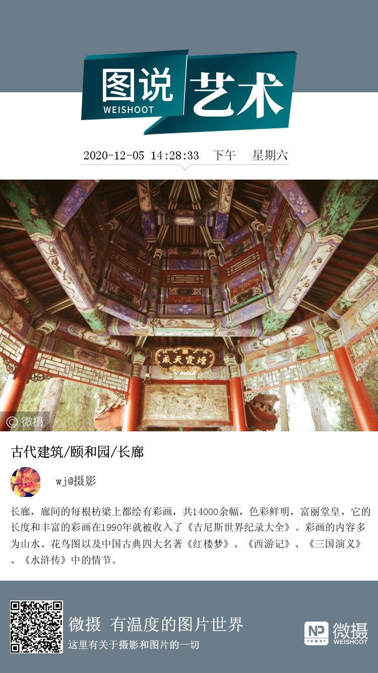 长廊,廊间的每根枋梁上都绘有彩画,共14000余幅,色彩鲜明,富丽堂皇,它的长度和丰富的彩画在1990年就被收入了《吉尼斯世界纪录大全》。彩画的内容多为山水、花鸟图以及中国古典四大名著《红楼梦》、《西游记》、《三国演义》、《水浒传》中的情节。