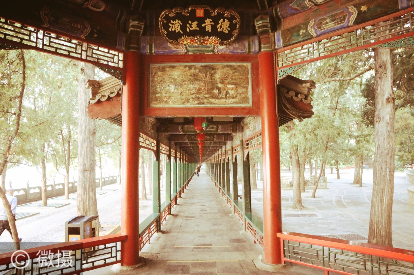 长廊,长度和丰富的彩画在1990年就被收入了《吉尼斯世界纪录大全》。彩画的内容多为山水、花鸟图以及中国古典四大名著《红楼梦》、《西游记》、《三国演义》、《水浒传》中的情节。画师们将中华数千年的历史文化浓缩在这长长的廊子上。其中许多风景画仿自江南山水,是画师们根据乾隆皇帝意图绘制。