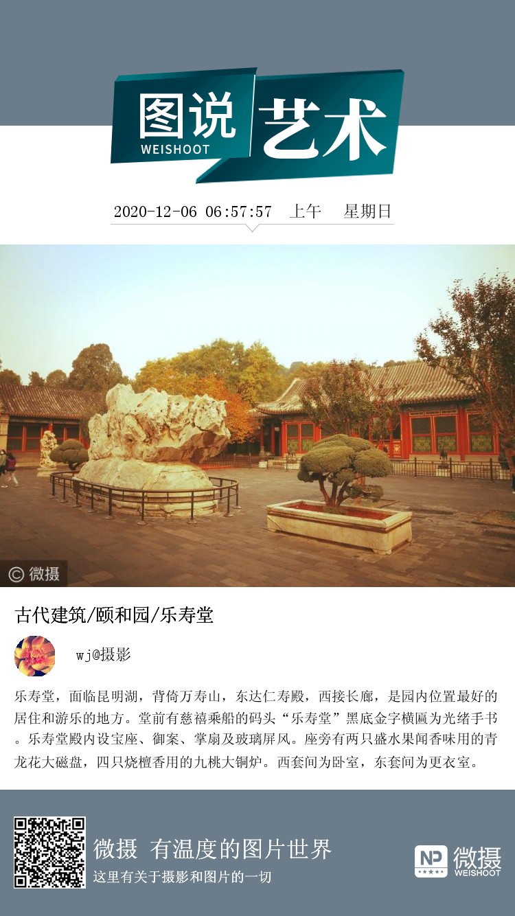 乐寿堂,面临昆明湖,背倚万寿山,东达仁寿殿,西接长廊,是园内位置最好的居住和游乐的地方。堂前有慈禧乘船的码头“乐寿堂”黑底金字横匾为光绪手书。乐寿堂殿内设宝座、御案、掌扇及玻璃屏风。座旁有两只盛水果闻香味用的青龙花大磁盘,四只烧檀香用的九桃大铜炉。西套间为卧室,东套间为更衣室。