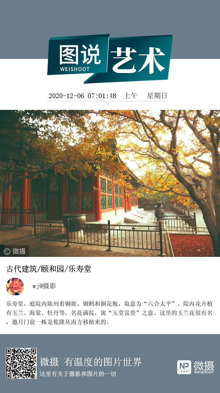 乐寿堂,庭院内陈列着铜鹿、铜鹤和铜花瓶,取意为“六合太平”。院内花卉植有玉兰、海棠、牡丹等,名花满院,寓“玉堂富贵”之意。这里的玉兰花很有名,邀月门前一株是乾隆从南方移植来的。