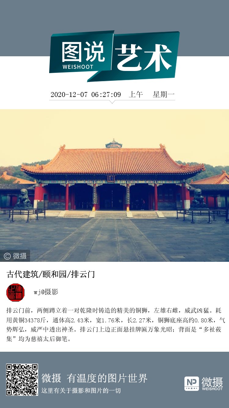 排云门前,两侧蹲立着一对乾隆时铸造的精美的铜狮,左雄右雌,威武凶猛。耗用黄铜34378斤,通体高2.43米,宽1.76米,长2.27米,铜狮底座高约0.80米,气势辉弘,威严中透出神圣。排云门上边正面悬挂牌匾万象光昭;背面是“多祉莜集”均为慈禧太后御笔。