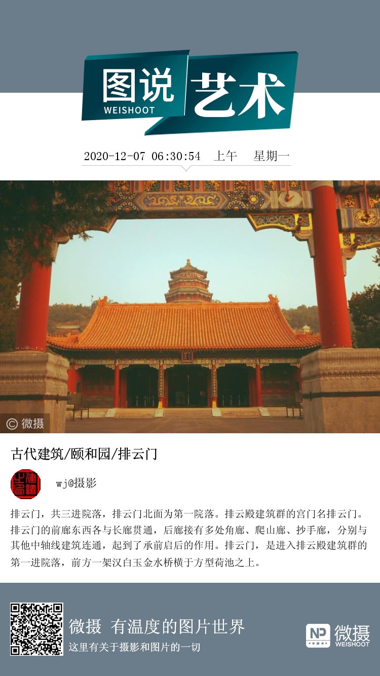 排云门,共三进院落,排云门北面为第一院落。排云殿建筑群的宫门名排云门。排云门的前廊东西各与长廊贯通,后廊接有多处角廊、爬山廊、抄手廊,分别与其他中轴线建筑连通,起到了承前启后的作用。排云门,是进入排云殿建筑群的第一进院落,前方一架汉白玉金水桥横于方型荷池之上。