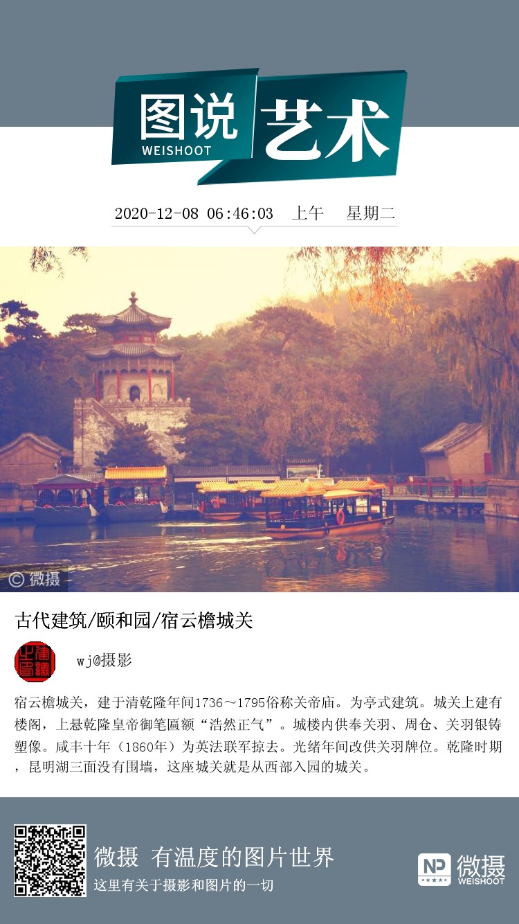 宿云檐城关,建于清乾隆年间1736~1795俗称关帝庙。为亭式建筑。城关上建有楼阁,上悬乾隆皇帝御笔匾额“浩然正气”。城楼内供奉关羽、周仓、关羽银铸塑像。咸丰十年(1860年)为英法联军掠去。光绪年间改供关羽牌位。乾隆时期,昆明湖三面没有围墙,这座城关就是从西部入园的城关。