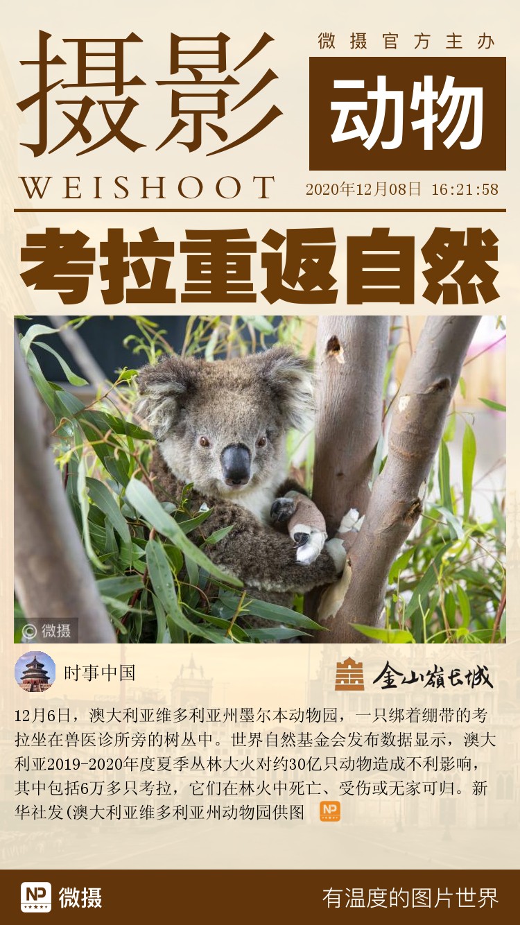 12月6日,澳大利亚维多利亚州墨尔本动物园,一只绑着绷带的考拉坐在兽医诊所旁的树丛中。世界自然基金会发布数据显示,澳大利亚2019-2020年度夏季丛林大火对约30亿只动物造成不利影响,其中包括6万多只考拉,它们在林火中死亡、受伤或无家可归。新华社发(澳大利亚维多利亚州动物园供图