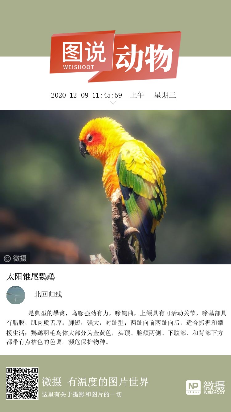 是典型的攀禽,鸟喙强劲有力,喙钩曲,上颌具有可活动关节,喙基部具有腊膜,肌肉质舌厚;脚短,强大,对趾型;两趾向前两趾向后,适合抓握和攀援生活;鹦鹉羽毛鸟体大部分为金黄色,头顶、脸颊两侧、下腹部、和背部下方都带有点桔色的色调。濒危保护物种。