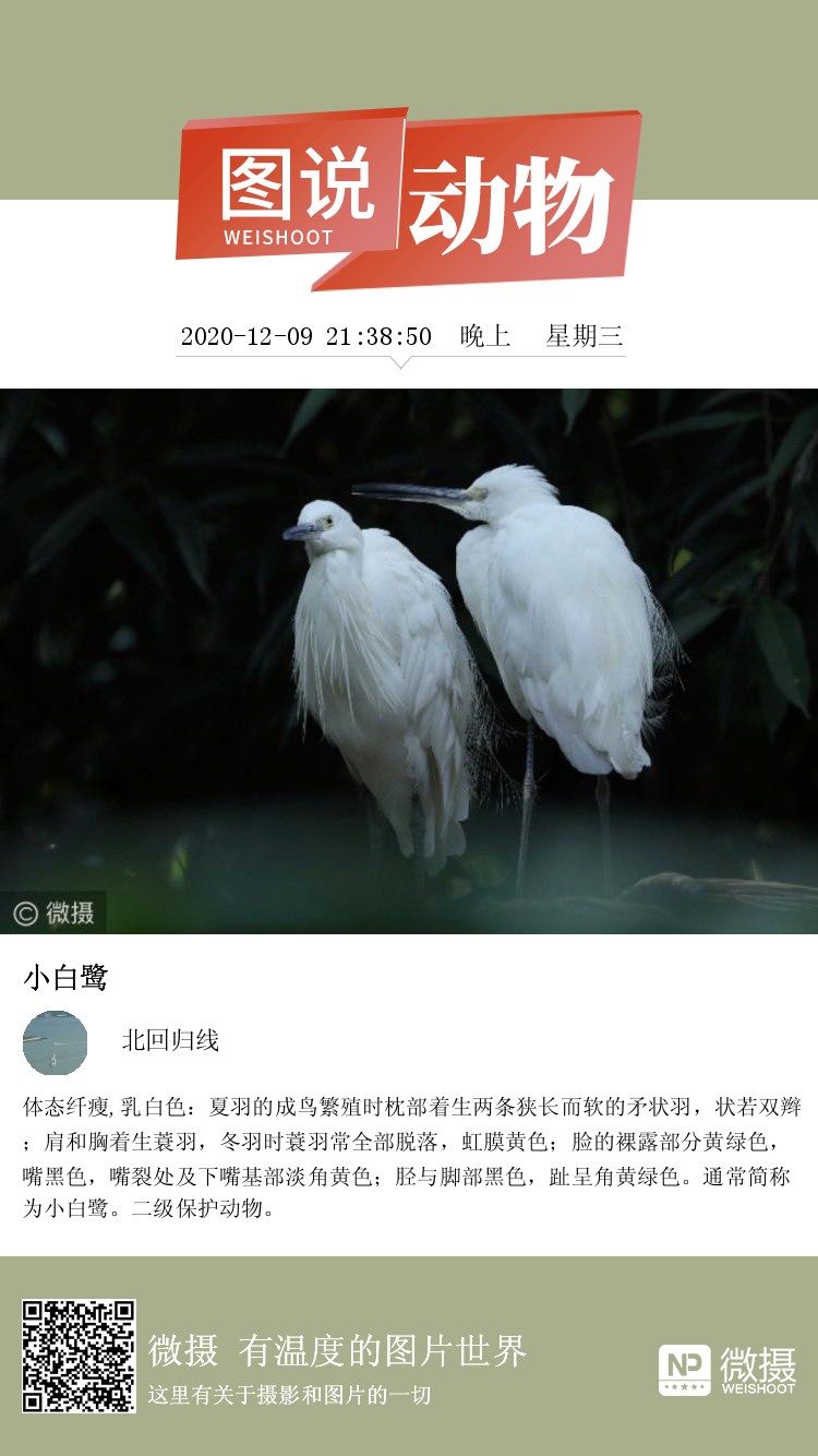 体态纤瘦,乳白色:夏羽的成鸟繁殖时枕部着生两条狭长而软的矛状羽,状若双辫;肩和胸着生蓑羽,冬羽时蓑羽常全部脱落,虹膜黄色;脸的裸露部分黄绿色,嘴黑色,嘴裂处及下嘴基部淡角黄色;胫与脚部黑色,趾呈角黄绿色。通常简称为小白鹭。二级保护动物。