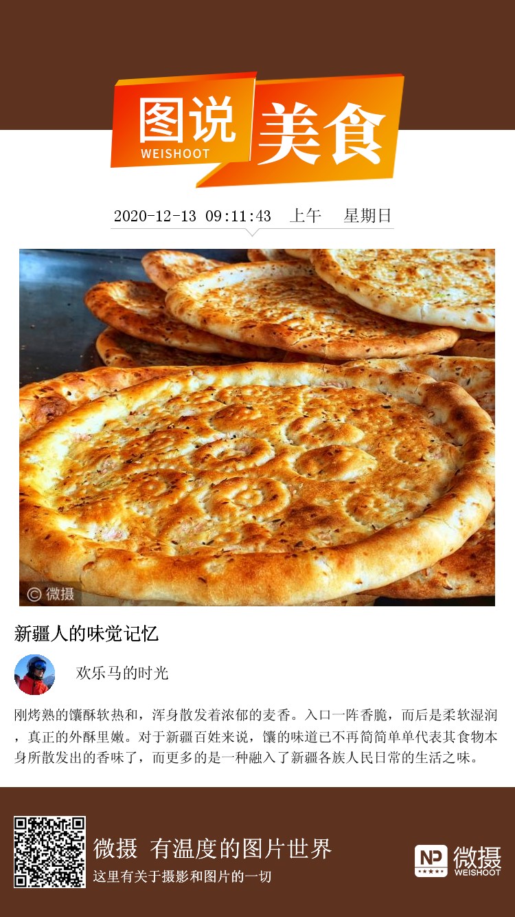 刚烤熟的馕酥软热和,浑身散发着浓郁的麦香。入口一阵香脆,而后是柔软湿润,真正的外酥里嫩。对于新疆百姓来说,馕的味道已不再简简单单代表其食物本身所散发出的香味了,而更多的是一种融入了新疆各族人民日常的生活之味。