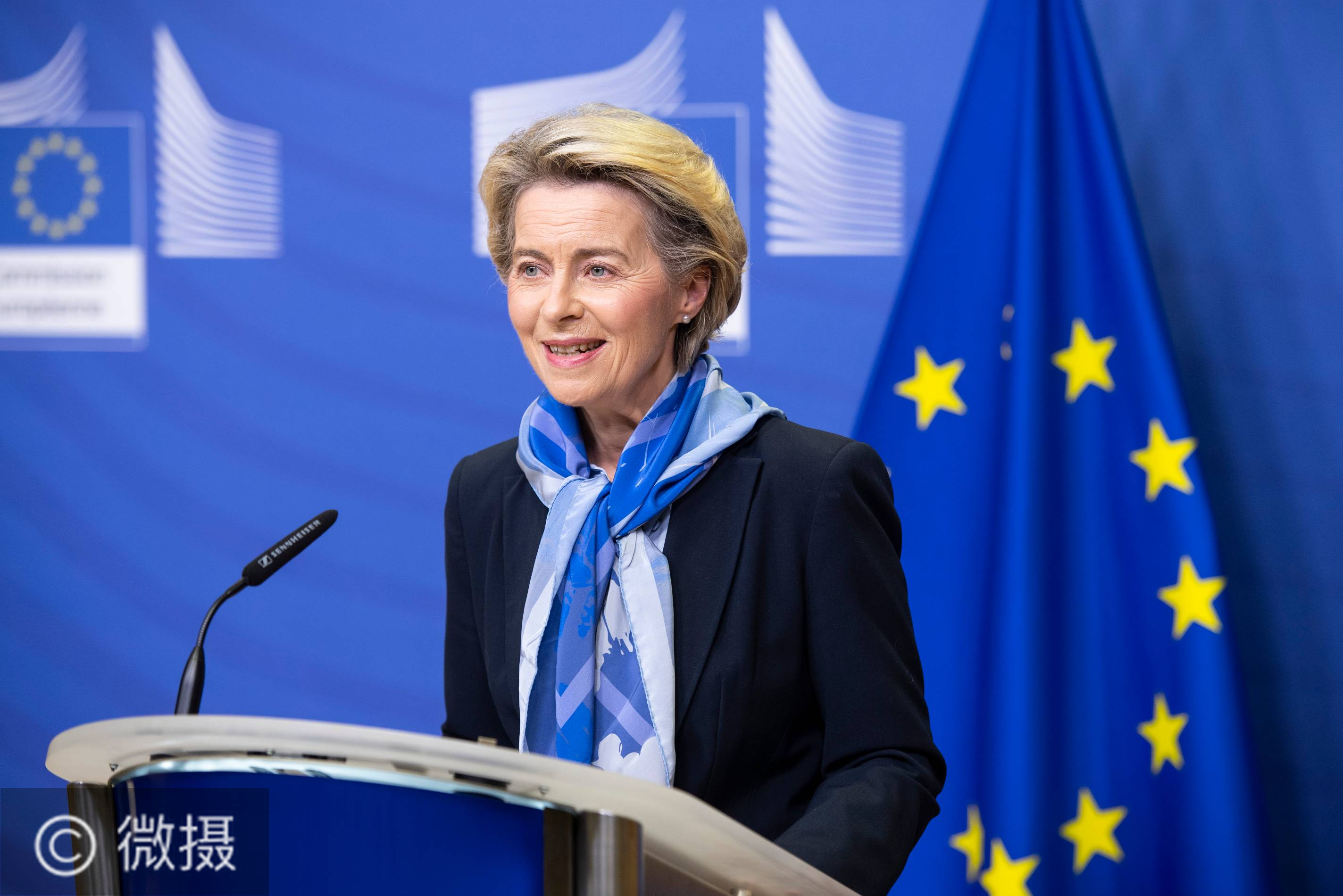 12月21日,在比利时布鲁塞尔,欧盟委员会主席冯德莱恩就疫苗有条件上市发表声明。欧洲药品管理局21日就美国辉瑞制药有限公司与德国生物新技术公司联合研发的一款新冠疫苗的安全性和有效性做出正面评估,欧盟委员会随后批准该疫苗在欧盟境内有条件上市。新华社发(欧盟供图)