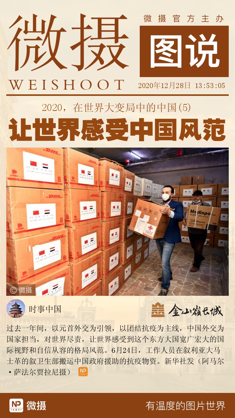 过去一年间,以元首外交为引领,以团结抗疫为主线,中国外交为国家担当,对世界尽责,让世界感受到这个东方大国宽广宏大的国际视野和自信从容的格局风范。6月24日,工作人员在叙利亚大马士革的叙卫生部搬运中国政府援助的抗疫物资。新华社发(阿马尔·萨法尔贾拉尼摄)