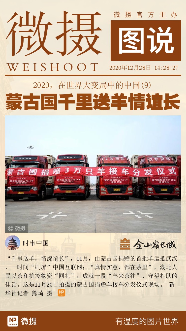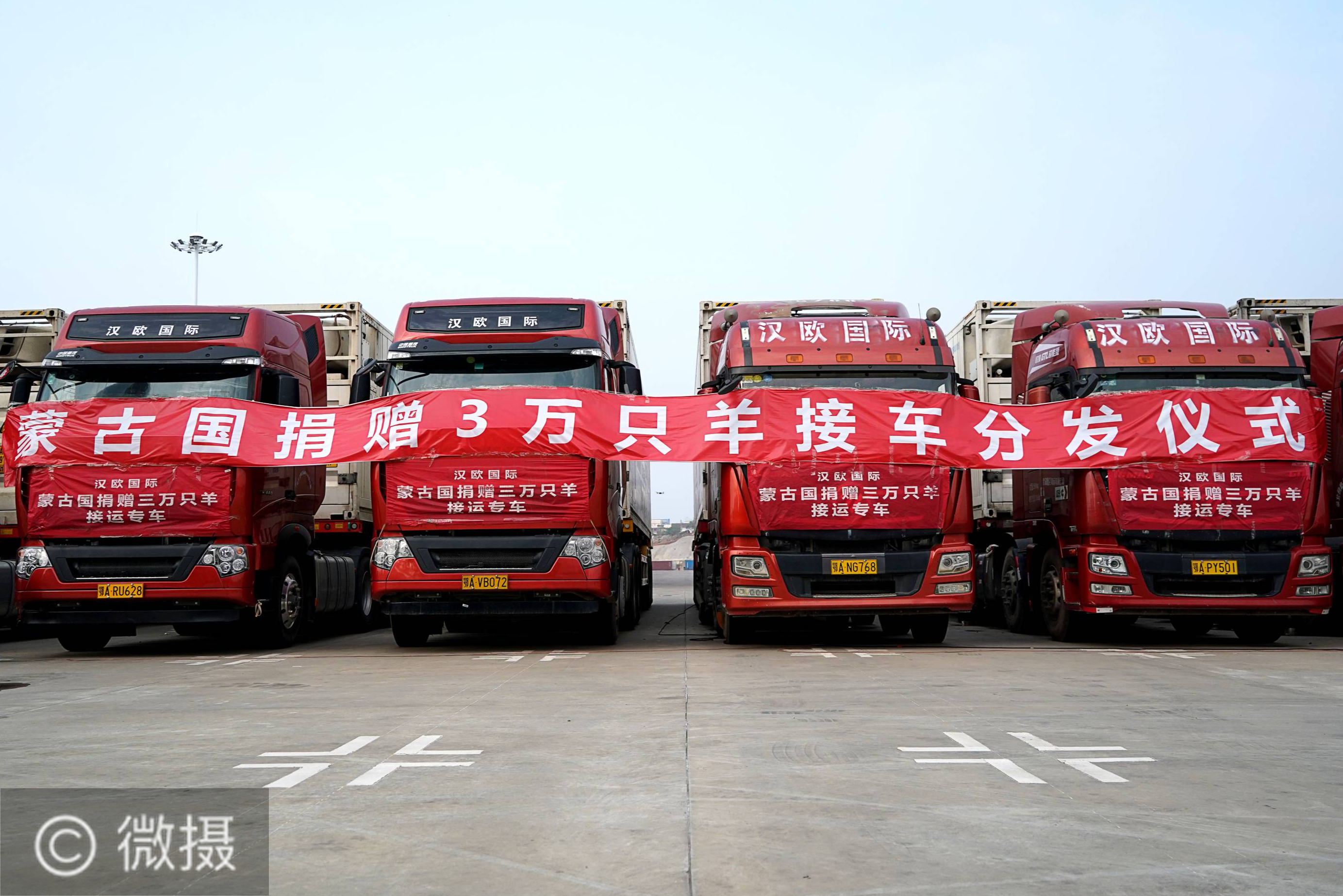 “千里送羊,情深谊长”,11月,由蒙古国捐赠的首批羊运抵武汉,一时间“刷屏”中国互联网;“真情实意,都在茶里”,湖北人民以茶和抗疫物资“回礼”,成就一段“羊来茶往”、守望相助的佳话。这是11月20日拍摄的蒙古国捐赠羊接车分发仪式现场。 新华社记者 熊琦 摄