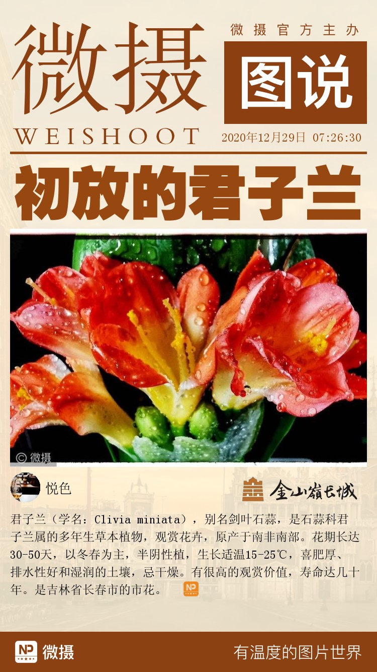 君子兰(学名:Clivia miniata),别名剑叶石蒜,是石蒜科君子兰属的多年生草本植物,观赏花卉,原产于南非南部。花期长达30-50天,以冬春为主,半阴性植,生长适温15-25℃,喜肥厚、排水性好和湿润的土壤,忌干燥。有很高的观赏价值,寿命达几十年。是吉林省长春市的市花。