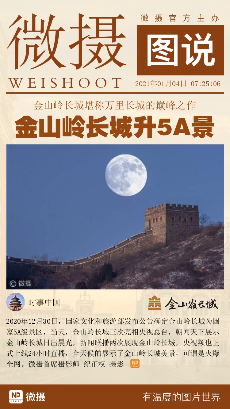 2020年12月30日,国家文化和旅游部发布公告确定金山岭长城为国家5A级景区,当天,金山岭长城三次亮相央视总台,朝闻天下展示金山岭长城日出晨光,新闻联播两次展现金山岭长城,央视频也正式上线24小时直播,全天候的展示了金山岭长城美景,可谓是火爆全网。微摄首席摄影师 纪正权 摄影