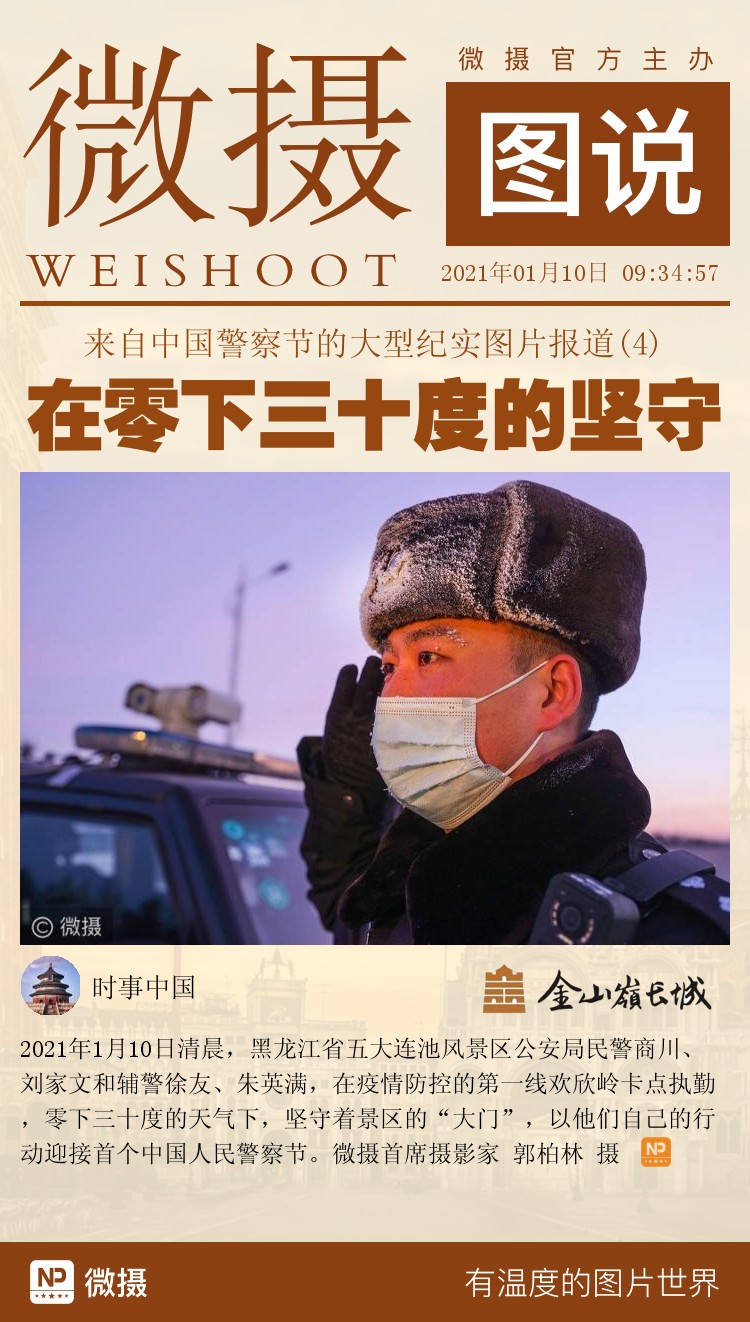 2021年1月10日清晨,黑龙江省五大连池风景区公安局民警商川、刘家文和辅警徐友、朱英满,在疫情防控的第一线欢欣岭卡点执勤,零下三十度的天气下,坚守着景区的“大门”,以他们自己的行动迎接首个中国人民警察节。微摄首席摄影家 郭柏林 摄