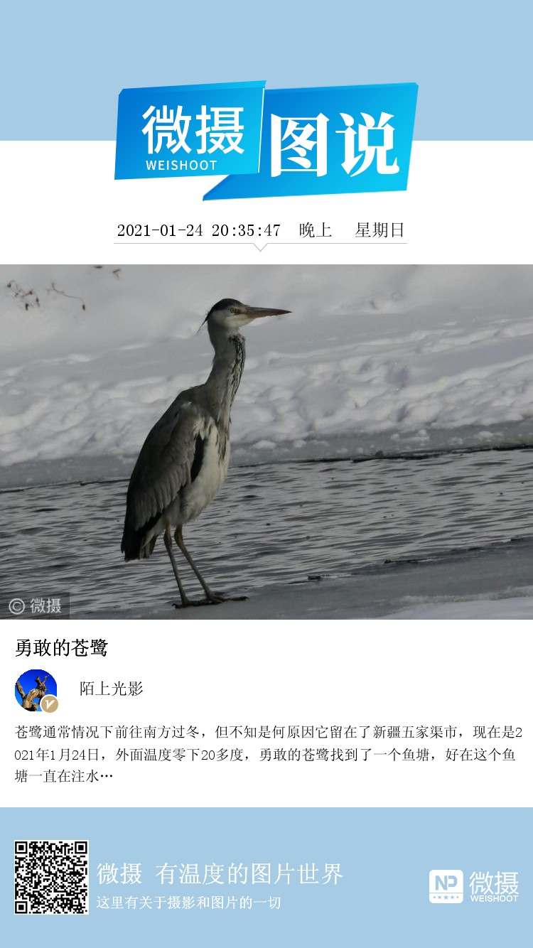 苍鹭通常情况下前往南方过冬,但不知是何原因它留在了新疆五家渠市,现在是2021年1月24日,外面温度零下20多度,勇敢的苍鹭找到了一个鱼塘,好在这个鱼塘一直在注水…