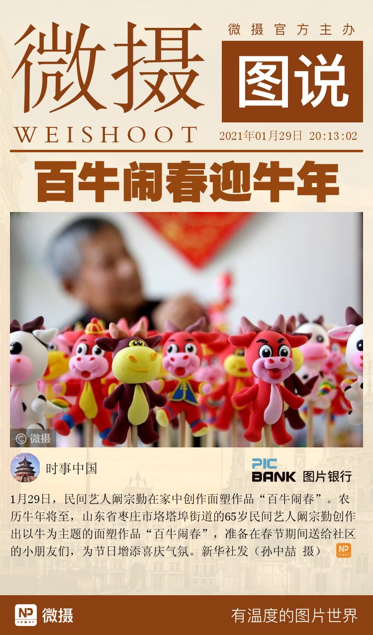 1月29日,民间艺人阚宗勤在家中创作面塑作品“百牛闹春”。农历牛年将至,山东省枣庄市垎塔埠街道的65岁民间艺人阚宗勤创作出以牛为主题的面塑作品“百牛闹春”,准备在春节期间送给社区的小朋友们,为节日增添喜庆气氛。新华社发(孙中喆 摄)