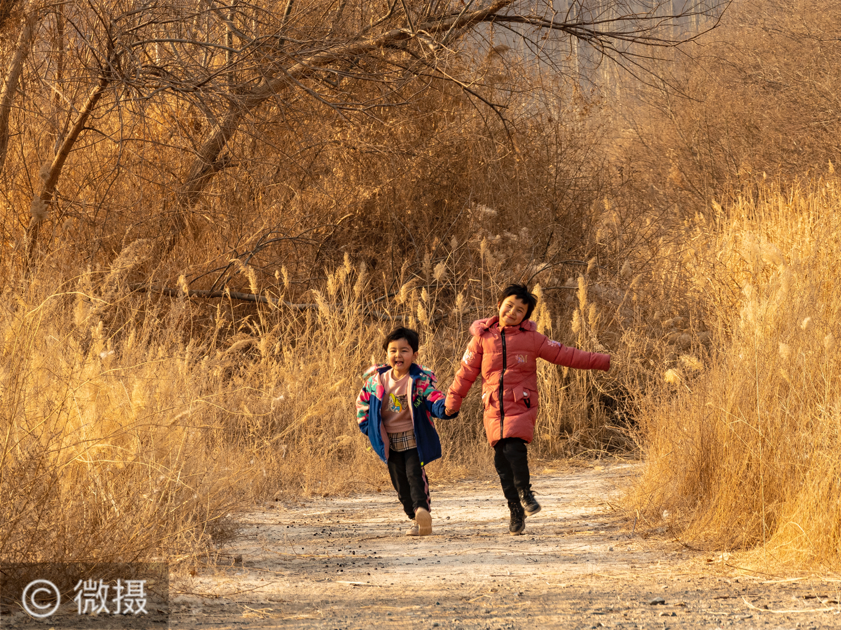 早春二月,惠风暖阳。6岁的穆柯莱斯和7岁的尤丽图孜在自家的门前路上玩耍。而吐哈油田的摄影家马新民主席、韩勇和我恰在此地,逢此暖景。在马主席的导演下,两个小女孩手拉手笑着蹦着,被定格成这幅《欢乐》。