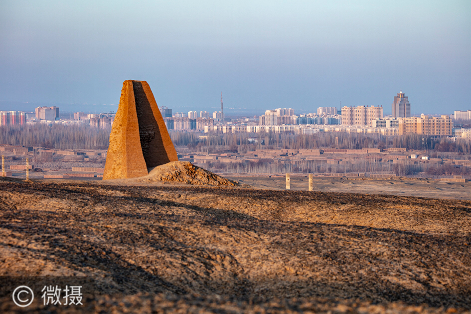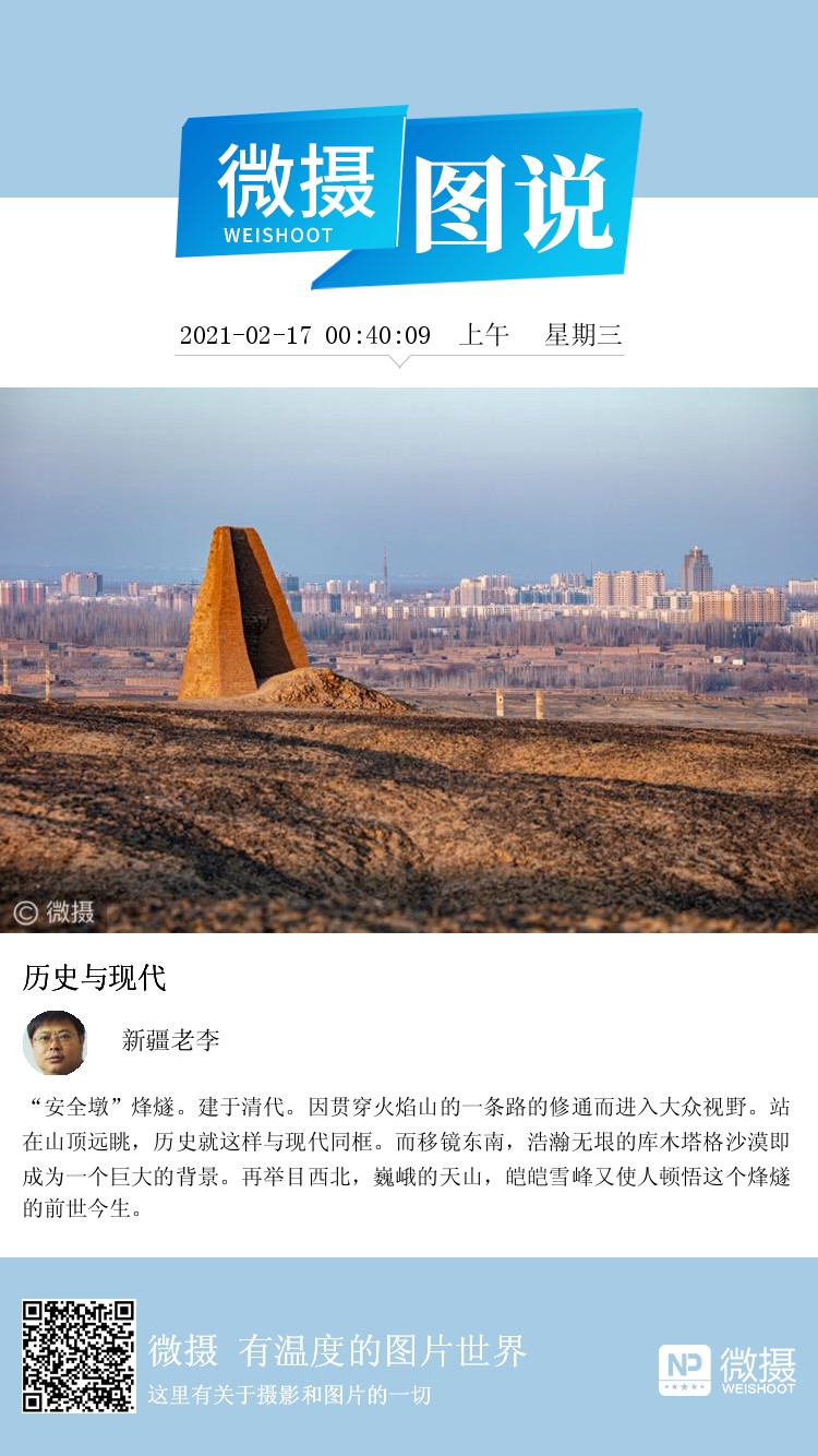“安全墩”烽燧。建于清代。因贯穿火焰山的一条路的修通而进入大众视野。站在山顶远眺,历史就这样与现代同框。而移镜东南,浩瀚无垠的库木塔格沙漠即成为一个巨大的背景。再举目西北,巍峨的天山,皑皑雪峰又使人顿悟这个烽燧的前世今生。
