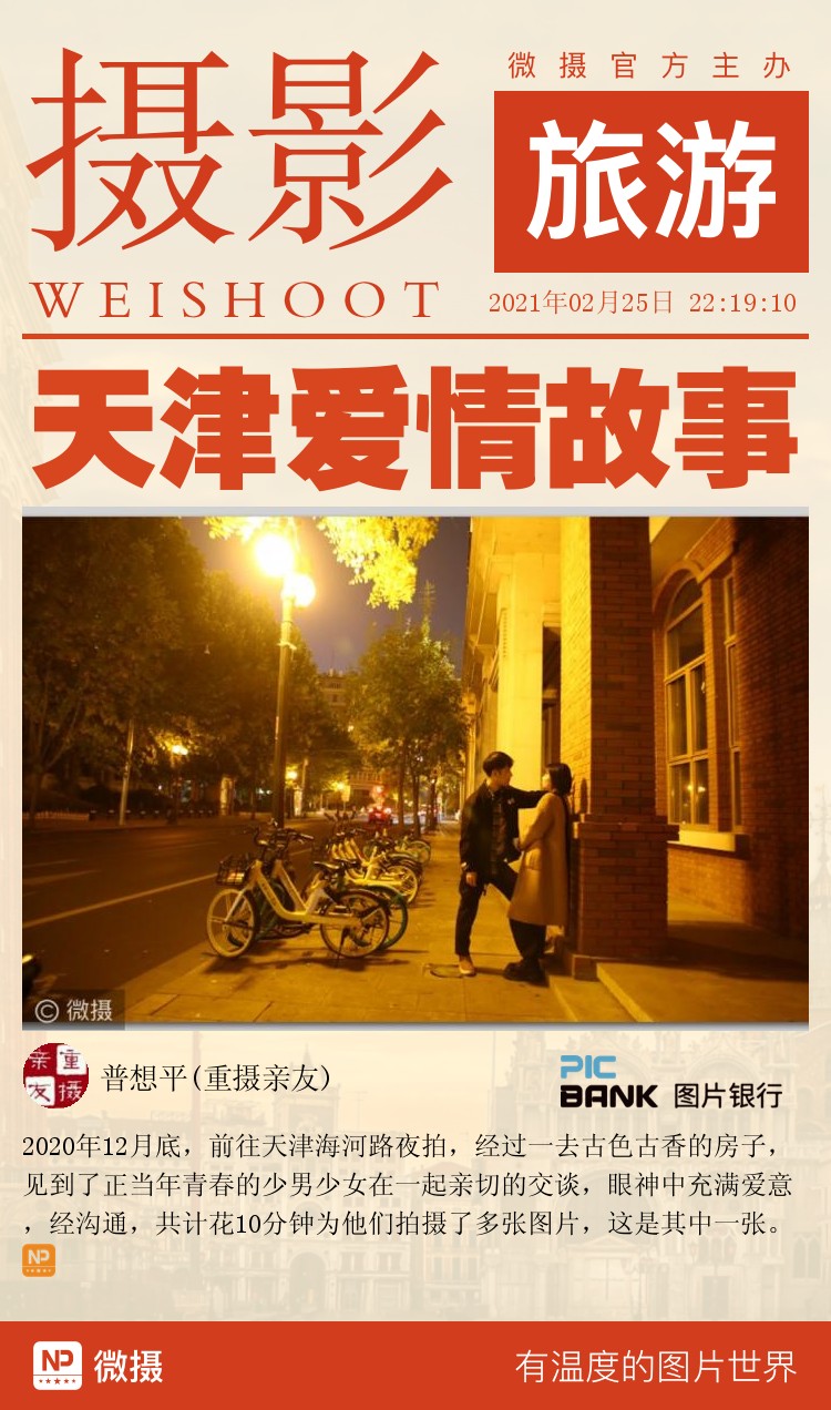 2020年12月底,前往天津海河路夜拍,经过一去古色古香的房子,见到了正当年青春的少男少女在一起亲切的交谈,眼神中充满爱意,经沟通,共计花10分钟为他们拍摄了多张图片,这是其中一张。