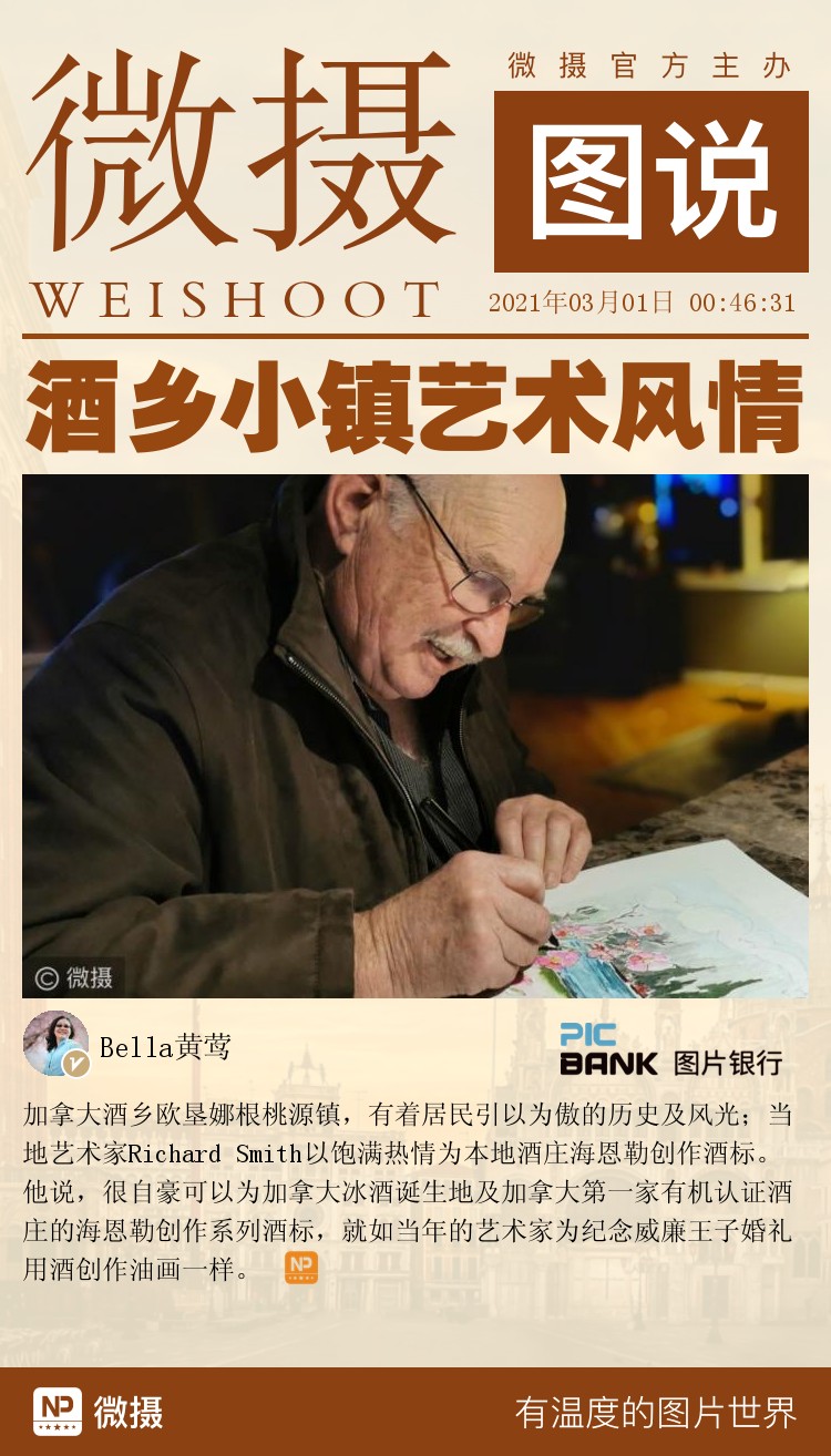 加拿大酒乡欧垦娜根桃源镇,有着居民引以为傲的历史及风光;当地艺术家Richard Smith以饱满热情为本地酒庄海恩勒创作酒标。他说,很自豪可以为加拿大冰酒诞生地及加拿大第一家有机认证酒庄的海恩勒创作系列酒标,就如当年的艺术家为纪念威廉王子婚礼用酒创作油画一样。
