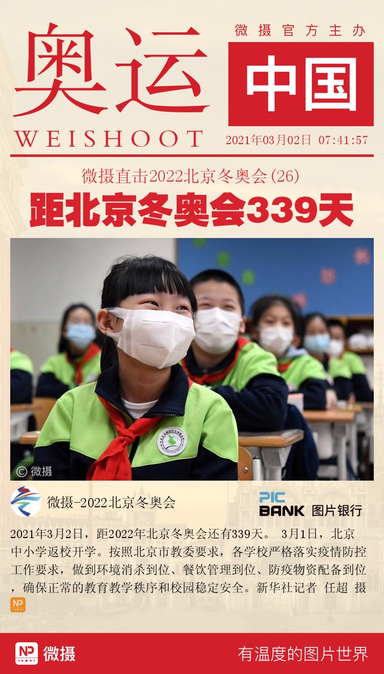 2021年3月2日,距2022年北京冬奥会还有339天。 3月1日,北京中小学返校开学。按照北京市教委要求,各学校严格落实疫情防控工作要求,做到环境消杀到位、餐饮管理到位、防疫物资配备到位,确保正常的教育教学秩序和校园稳定安全。新华社记者 任超 摄