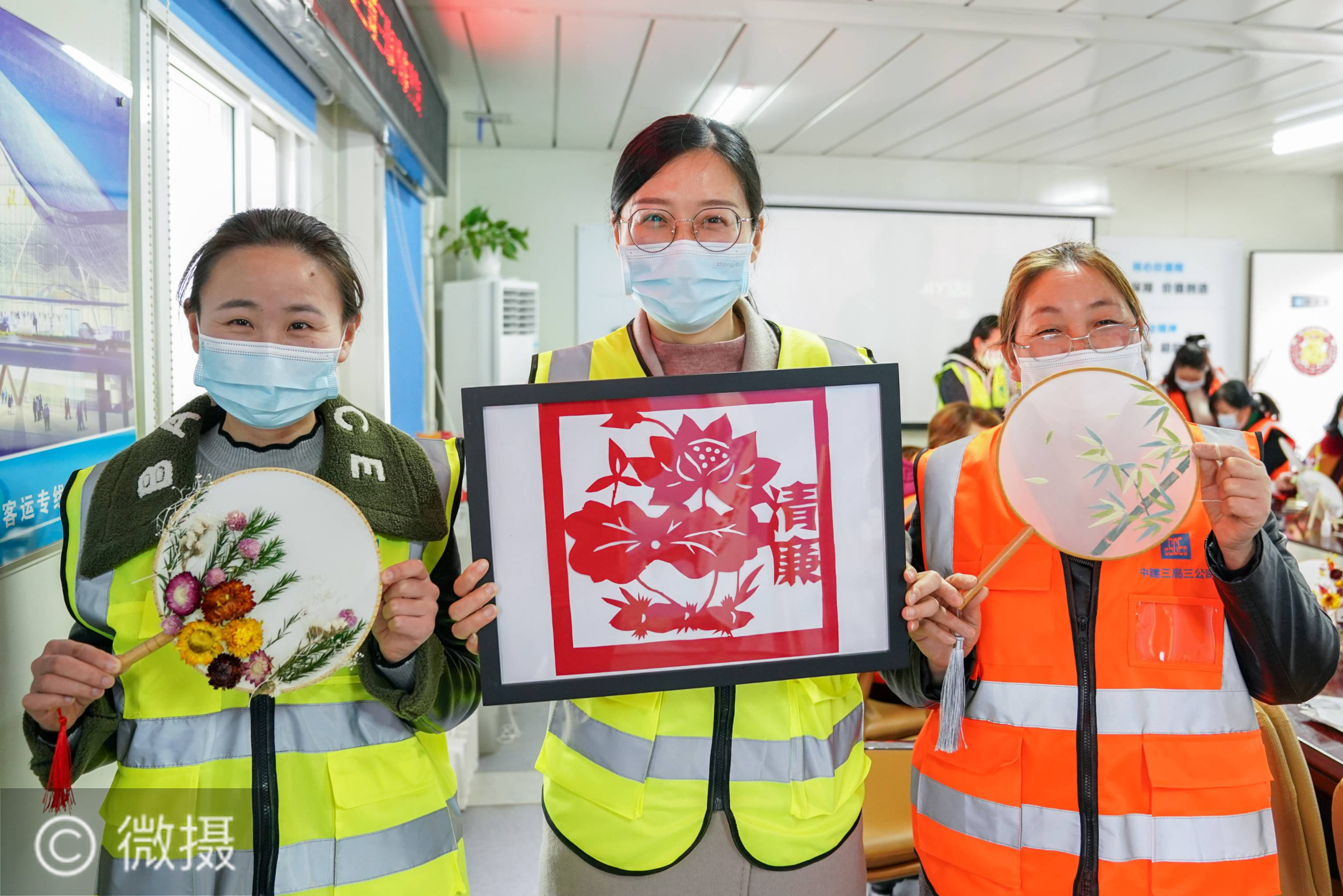 3月6日,中建三局三公司华东分公司上海某项目部的工地女工在展示作品。“三八”国际妇女节前夕,中建三局三公司华东分公司上海某项目部的工地女工齐聚一堂,以剪纸、刺绣、制作创意扇子等形式欢度节日。她们中有木工、钢筋工、混凝土工、保洁员等。新华社记者丁汀摄
