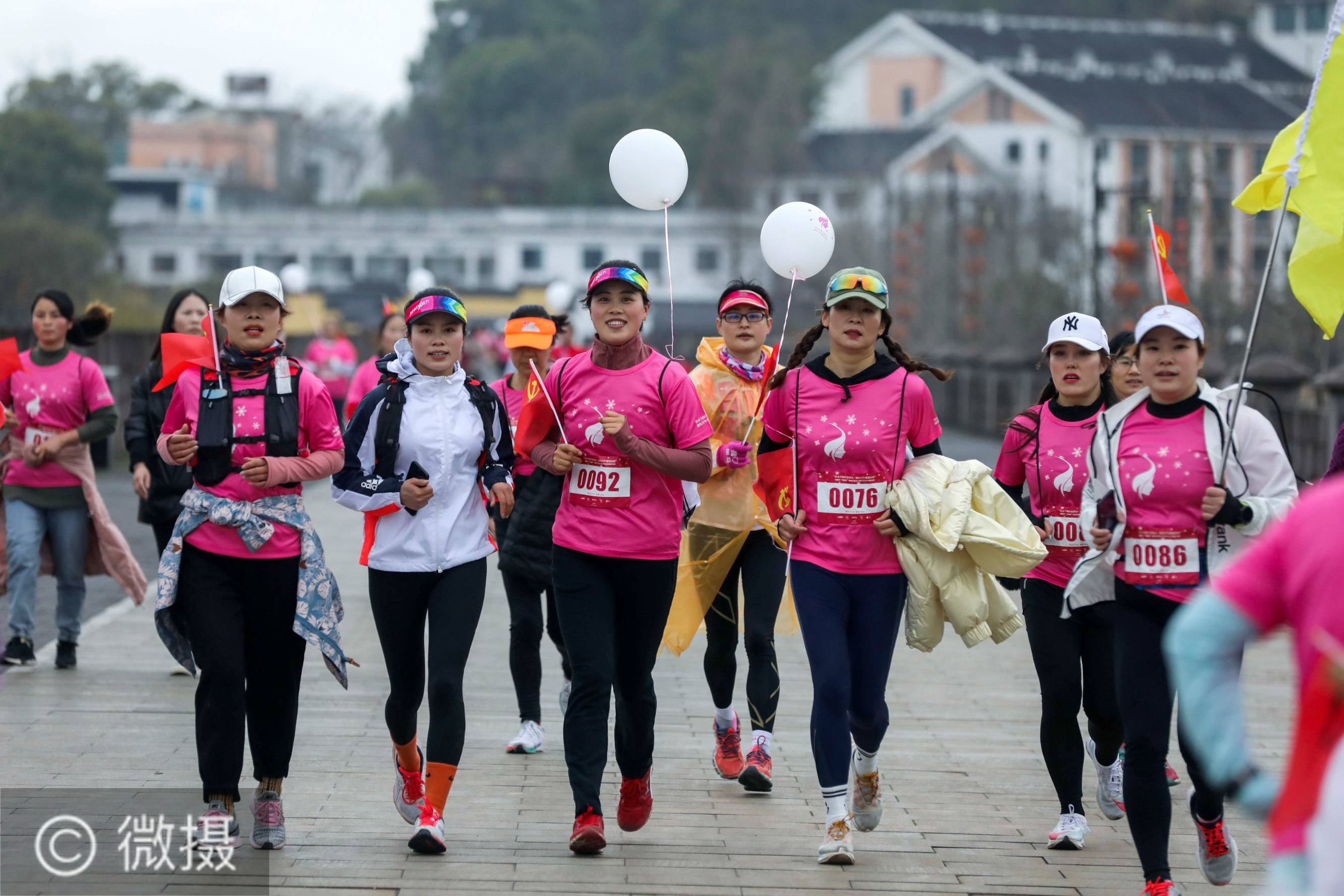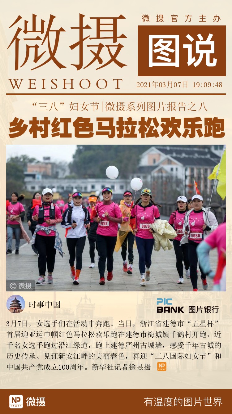 3月7日,女选手们在活动中奔跑。当日,浙江省建德市“五星杯”首届迎亚运巾帼红色马拉松欢乐跑在建德市梅城镇千鹤村开跑,近千名女选手跑过沿江绿道,跑上建德严州古城墙,感受千年古城的历史传承、见证新安江畔的美丽春色,喜迎“三八国际妇女节”和中国共产党成立100周年。新华社记者徐昱摄