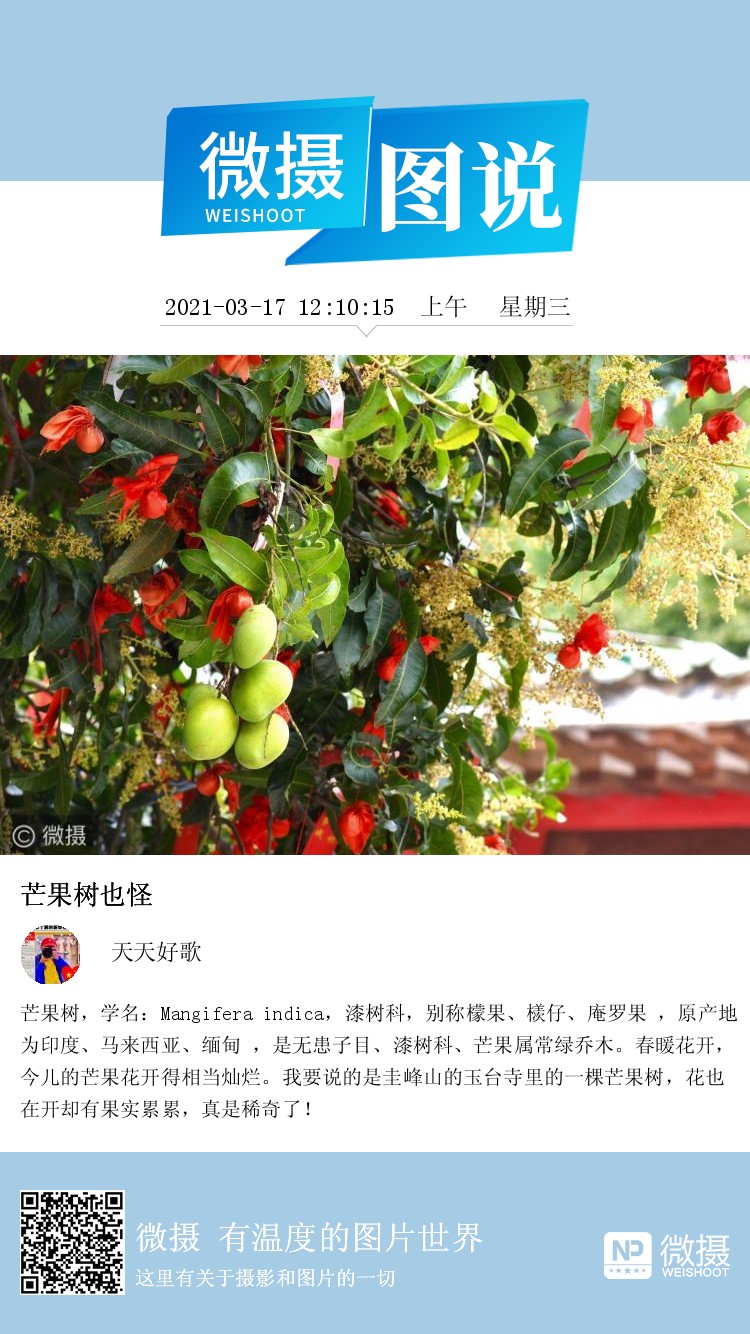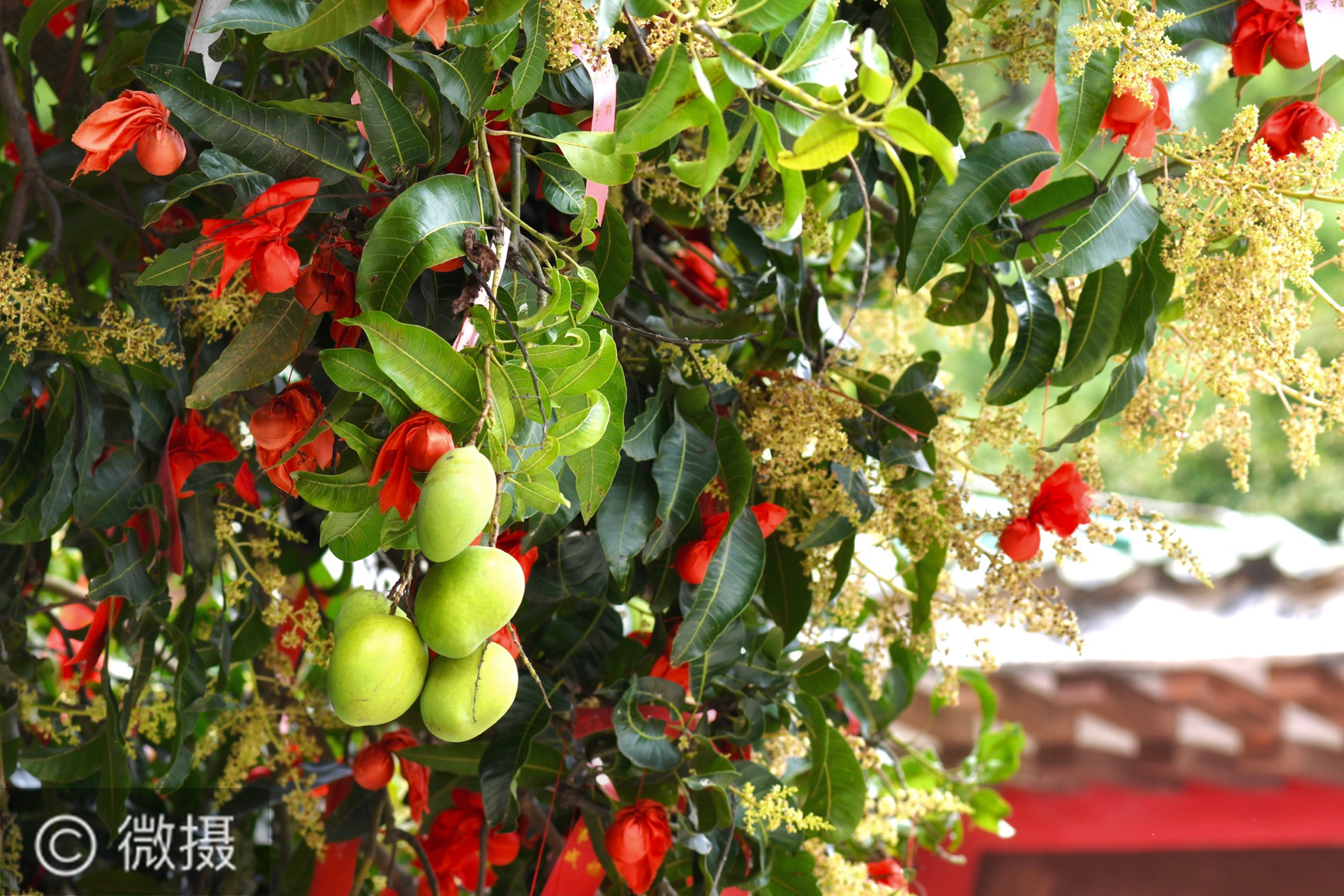 芒果树,学名:Mangifera indica,漆树科,别称檬果、檨仔、庵罗果 ,原产地为印度、马来西亚、缅甸 ,是无患子目、漆树科、芒果属常绿乔木。春暖花开,今儿的芒果花开得相当灿烂。我要说的是圭峰山的玉台寺里的一棵芒果树,花也在开却有果实累累,真是稀奇了!